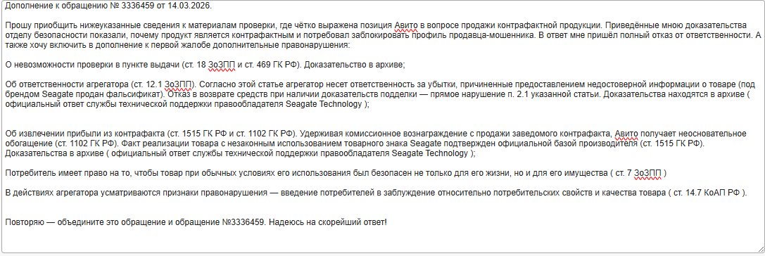 И заполучив свои сокровища я написал РПН дополнение к своей жалобе:
