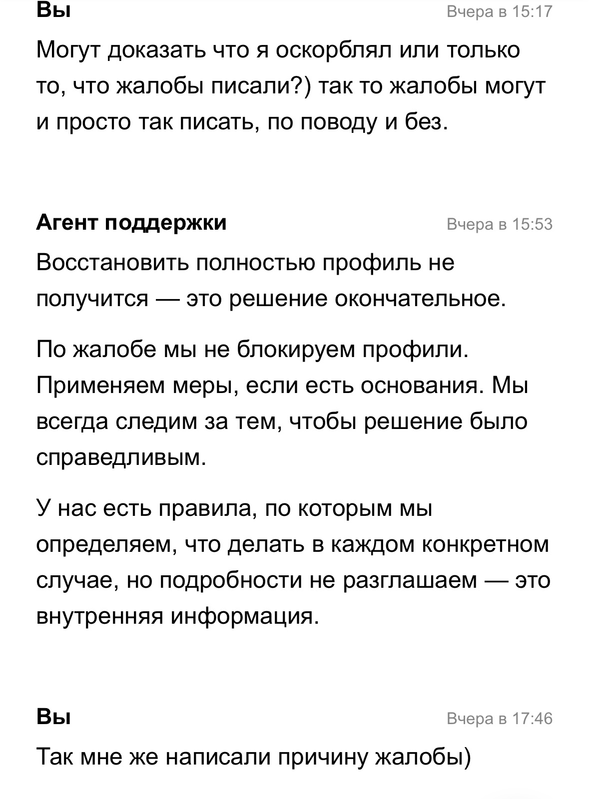 Хотел бы добавить новостей, вдруг кому эта ситуация интересна, может бля себя кто-то выводы сделает. Поддержка отвечает шаблонно, где бы ты им не писал, куда бы не звонил все одна и та же паста. От без исходности я решил съездить в главный офис в Москву, в глубине души я понимал что еду впустую и даже на порог меня не впустят. На ресепшен встретила девушка, сказала что встреча возможна, если у меня есть знакомый в компании или меня пригласил менеджер. Я оставил свой номер, в течении 15 минут мне позвонил менеджер статусом повыше. Сказал встреча вообще никак не возможна, и создала обращение на почту. Потом начала общаться точно такой же пастой как и ранее делали другие представители компании. В добавок ко всему этому, мне дали мут на диалоги, написать я могу, но сообщения не доходят до человека. Мне пишут старые клиенты, люди интересуются где теперь купить и что случилось, к сожалению я могу только читать. Ниже будут скрины общения с поддержкой, они сами будто не знают своих правил, у всех разные ответы). Почитайте и поймите всю абсурдность ситуации. В одном сообщении говорят что заблокировали по жалобам, в другом что не блокируют по жалобам, в третьем что вообще не встревают в диалоги между покупателем и продавцом. Я попросил дать второй шанс мне, ибо аккаунт очень развитый с большой клиентской базой, но без успешно.