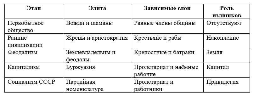 Появление частной собственности и накопление богатств усилили процесс социальной дифференциации. Одни индивиды или группы начали концентрировать ресурсы, контролировать доступ к ним и использовать труд других. Это привело к выделению элит, обладающих средствами производства, и зависимых слоёв, вынужденных обменивать свой труд на доступ к этим ресурсам. В ранних цивилизациях Шумера или Древнего Египта классовая структура закреплялась через религиозные и правовые системы. Например, фараоны и жрецы оправдывали своё превосходство божественным происхождением, тогда как крестьяне и ремесленники считались обязаны обеспечивать элиту.