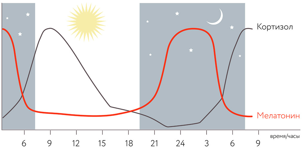 Эти гормоны являются антагонистами, т.е. их уровни в крови обычно меняются в обратной пропорции . Поэтому вечером высокий уровень кортизола от стресса и низкий уровень мелатонина от избытка света мешают нам заснуть. А утром излишки мелатонина от темноты или нехватка кортизола от сбитого режима делают нас сонными и мешают полноценно начать день вовремя.