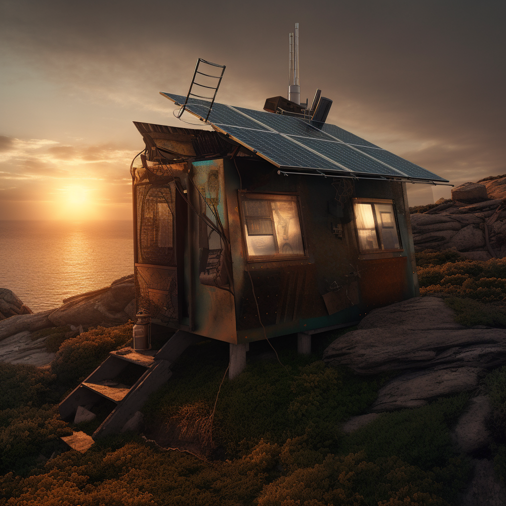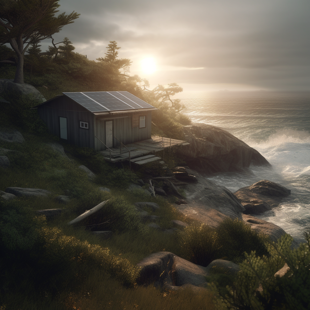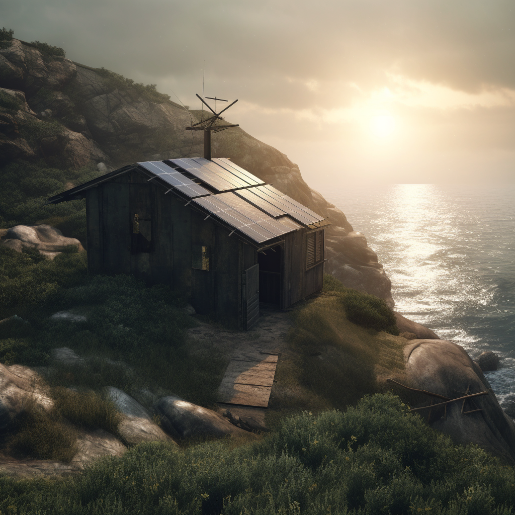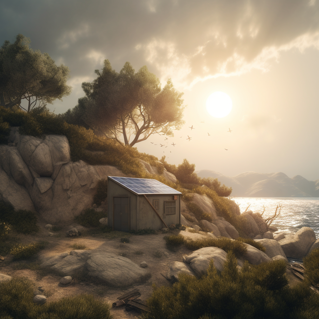 poor hut with sun battery by the sea, surrounded by a wild landscape with trees and rocks. Old, gloomy atmosphere. high tech low life. Ultra Realistic. Cinematic. Highly detailed. Full photorealism.