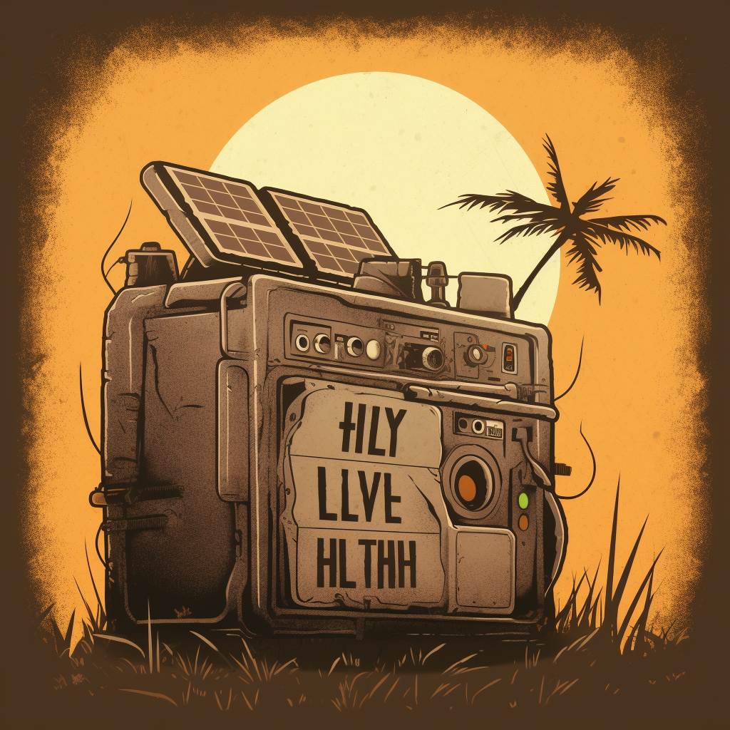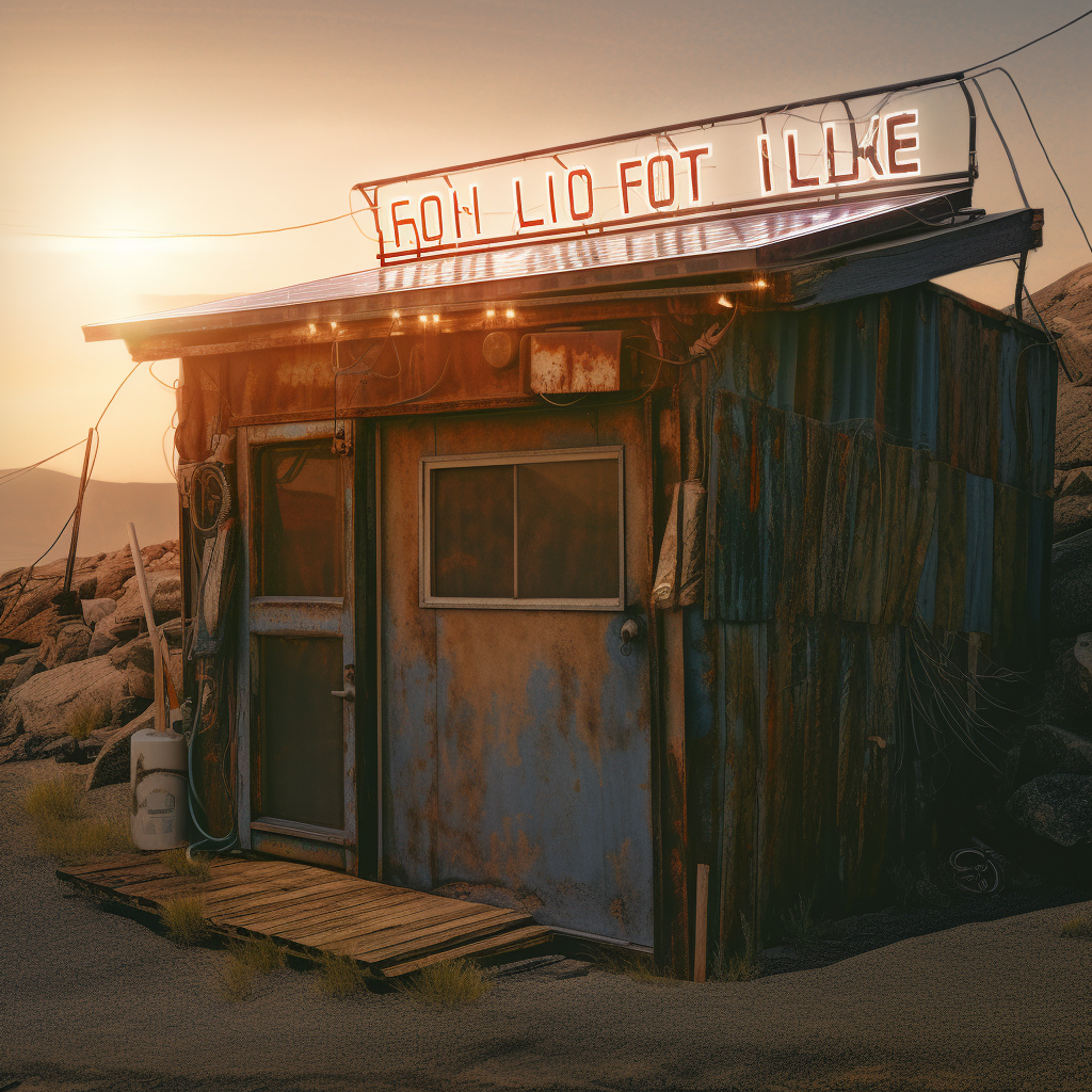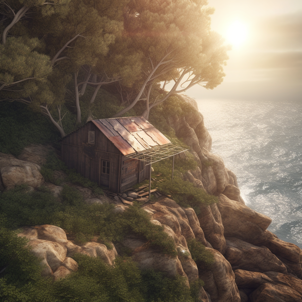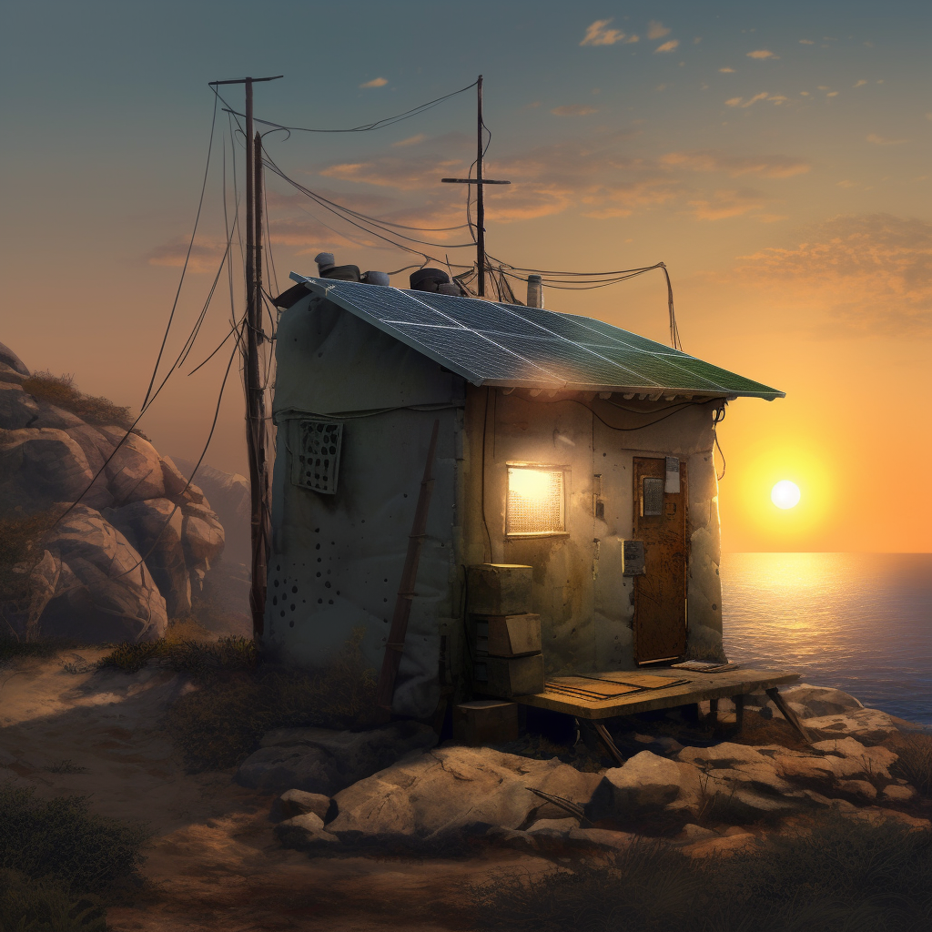 poor hut with sun battery by the sea, surrounded by a wild landscape with trees and rocks. Old, gloomy atmosphere. high tech low life. Ultra Realistic. Cinematic. Highly detailed. Full photorealism.