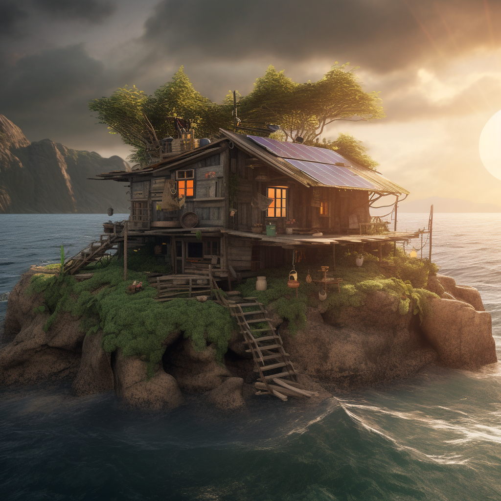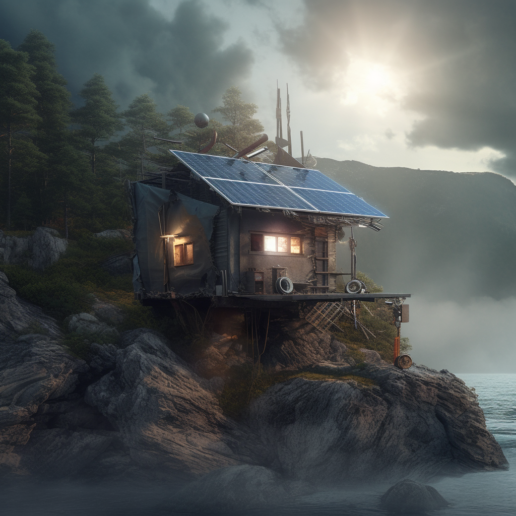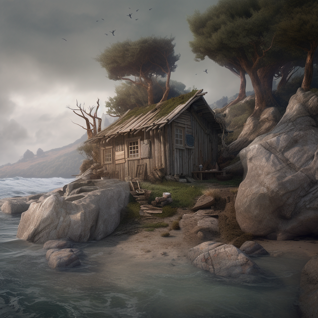 poor hut with sun battery by the sea like in fairy tail of grimm brothers with name the fisherman and his wife, surrounded by a wild landscape with trees and rocks. high tech low life. Old, gloomy atmosphere. Ultra Realistic. Cinematic. Highly detailed. Full photorealism.:: high tech low life::1 sun battery::0.5 fairy tail of grimm brothers with name the fisherman and his wife::0.5