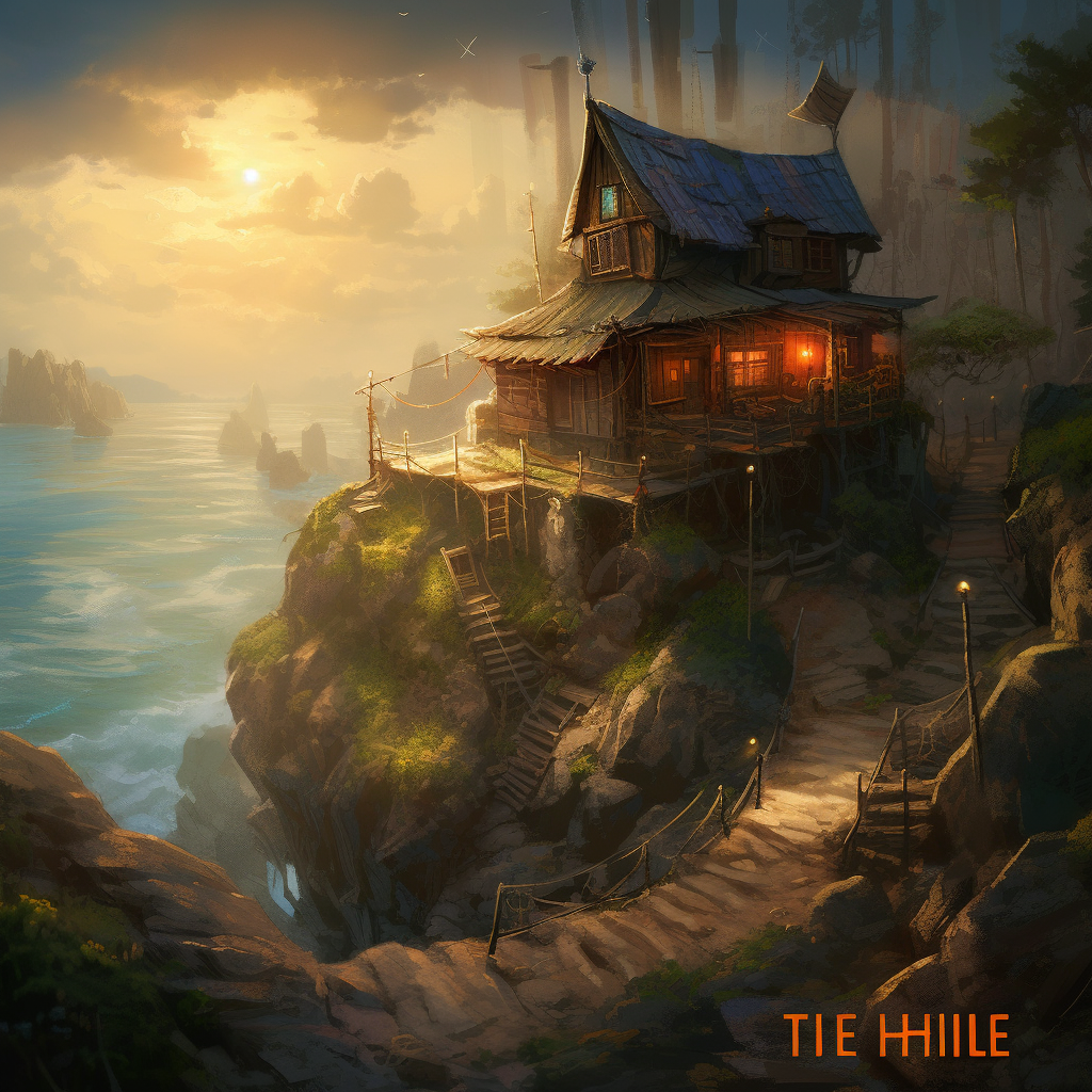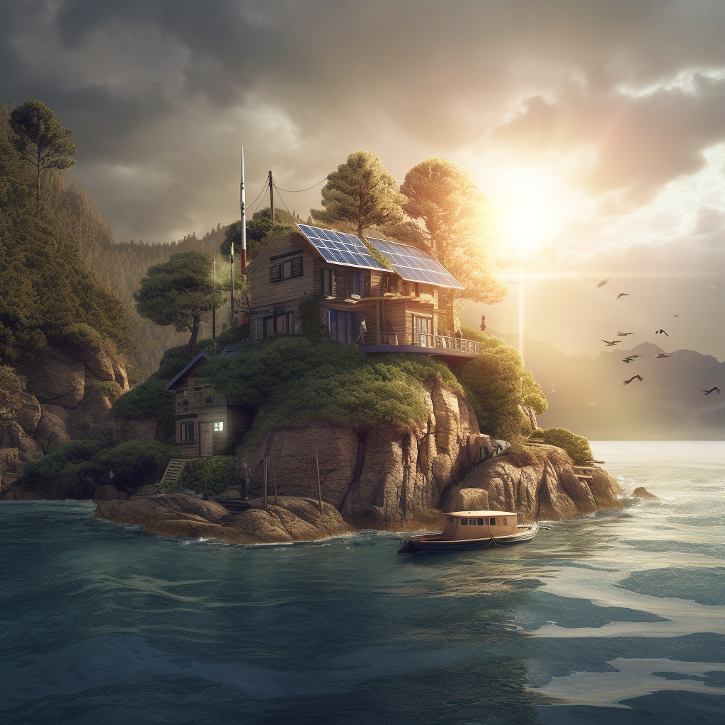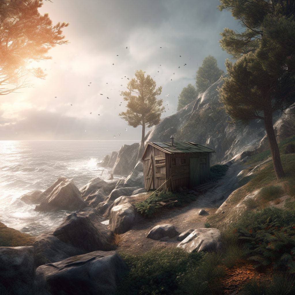 poor hut with sun battery by the sea like in fairy tail of grimm brothers with name the fisherman and his wife, surrounded by a wild landscape with trees and rocks. high tech low life. Old, gloomy atmosphere. Ultra Realistic. Cinematic. Highly detailed. Full photorealism.:: high tech low life::1 sun battery::0.5 fairy tail of grimm brothers with name the fisherman and his wife::0.5