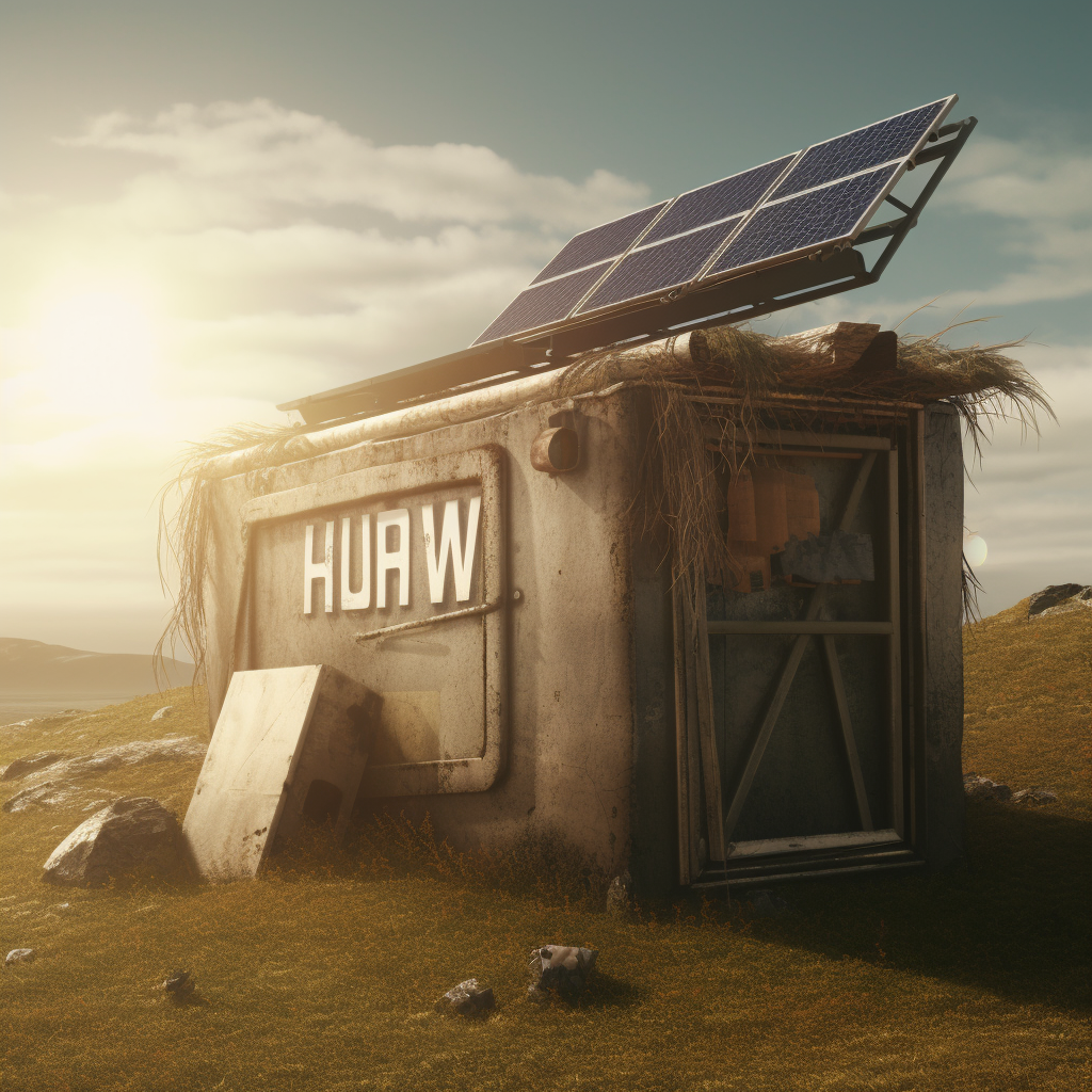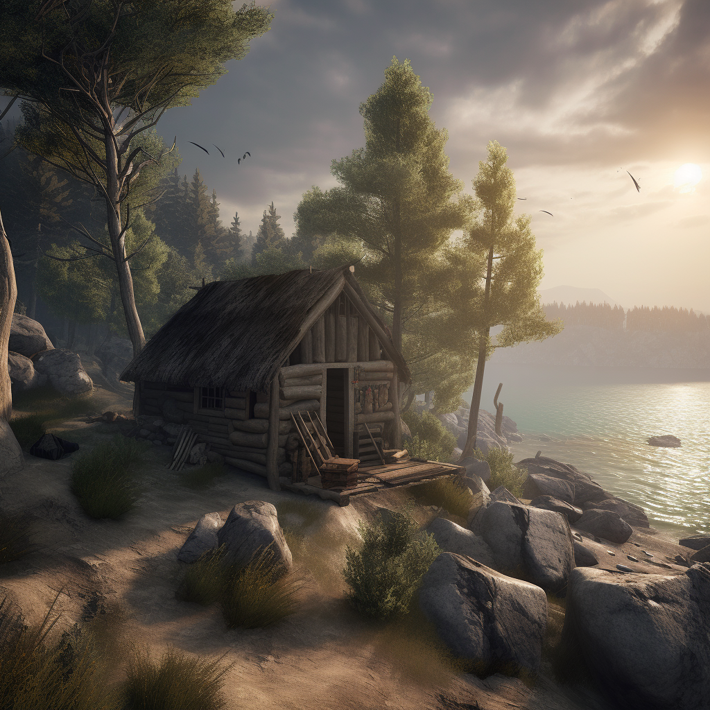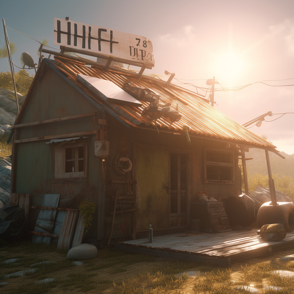 poor hut with sun battery by the sea like in fairy tail of grimm brothers with name the fisherman and his wife, surrounded by a wild landscape with trees and rocks. high tech low life. Old, gloomy atmosphere. Ultra Realistic. Cinematic. Highly detailed. Full photorealism.:: high tech low life::1 sun battery::0.5
