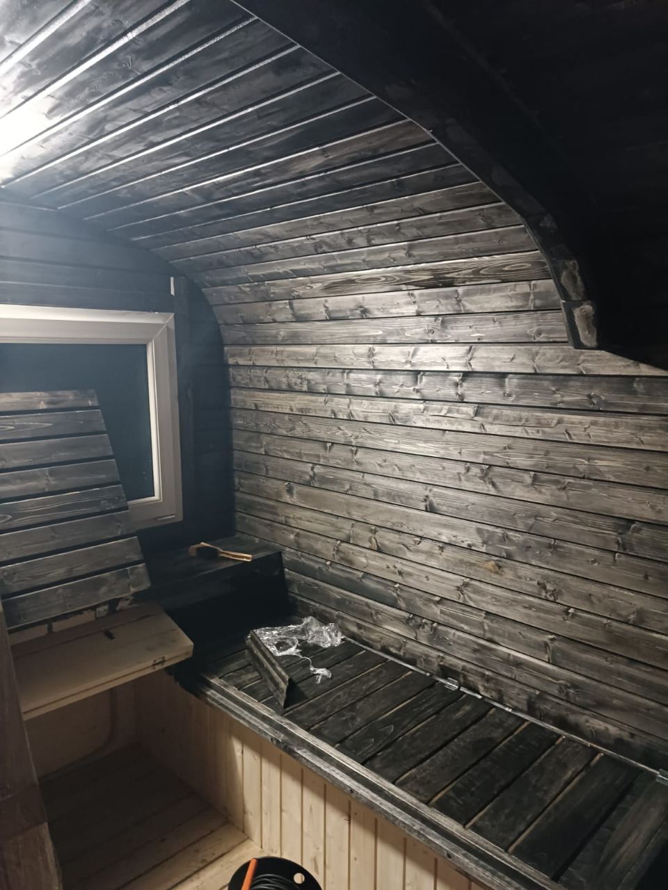 Стены и потолок TIKURILA SUPI SAUNA PROTECT. Полки TIKURILA SUPI SAUNAVAHA. Цвет ежевика 4443.
