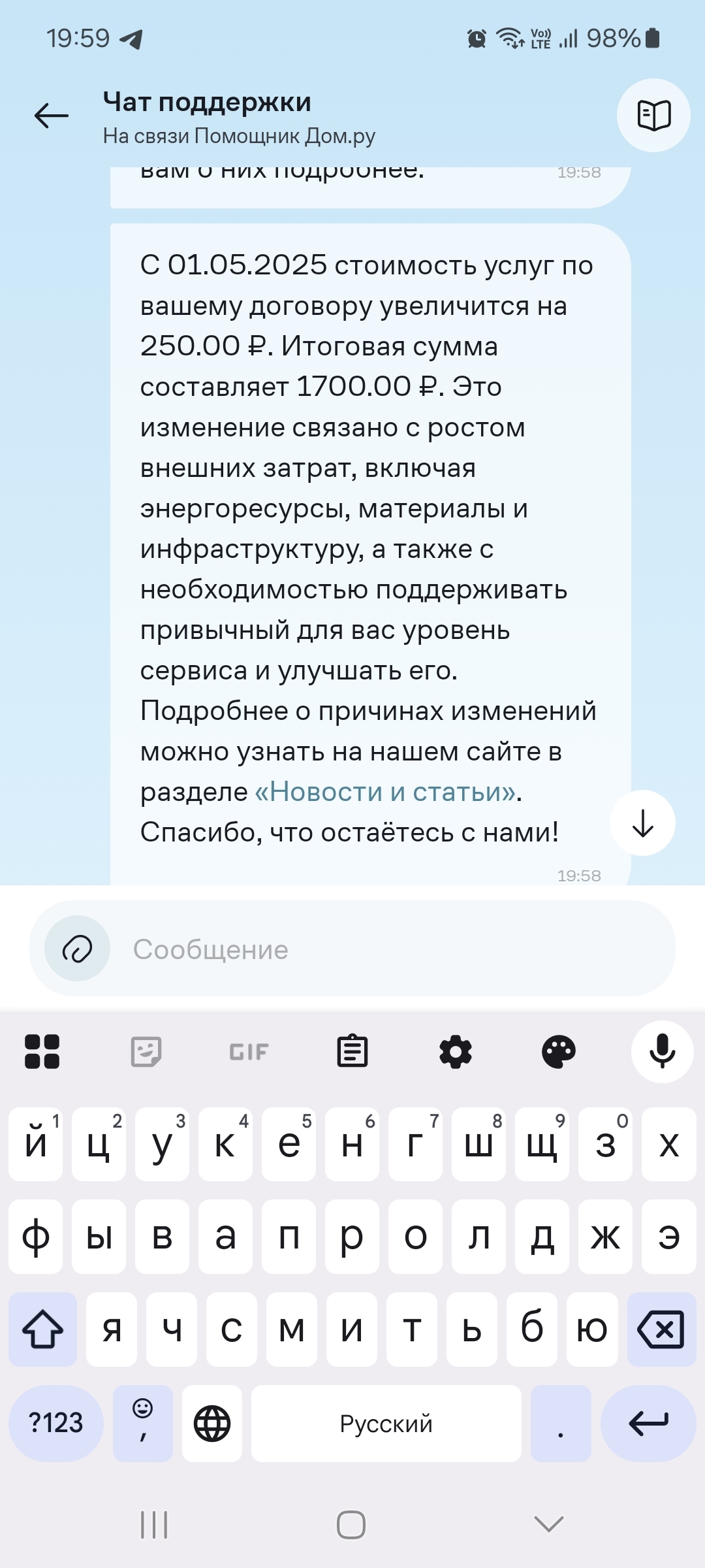 4 FantaZm91 Продолжение поста «Дом ру оху*ел?»1 8 месяцев назад Вчера делал пост про повышение тарифа , сегодня дом ру в чате прислал ответ и повысил его ещё на 250 р , нет слов , лучше Ростелеком подключу )) Дом ру Тарифы Беспредел Мат Ответ на пост Длиннопост 1 Ещё 0