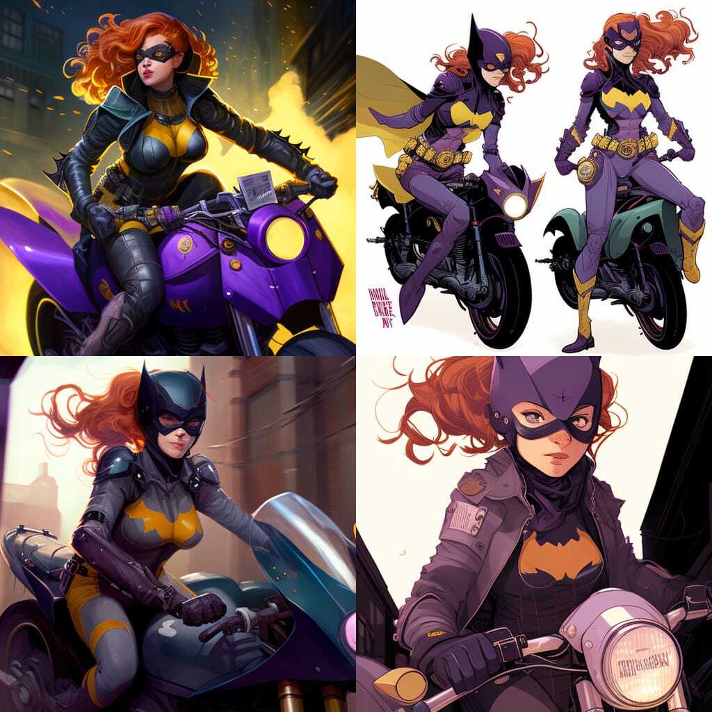 Промпт: Jinny Weasley in batgirl's suite rides on bike