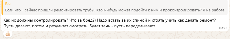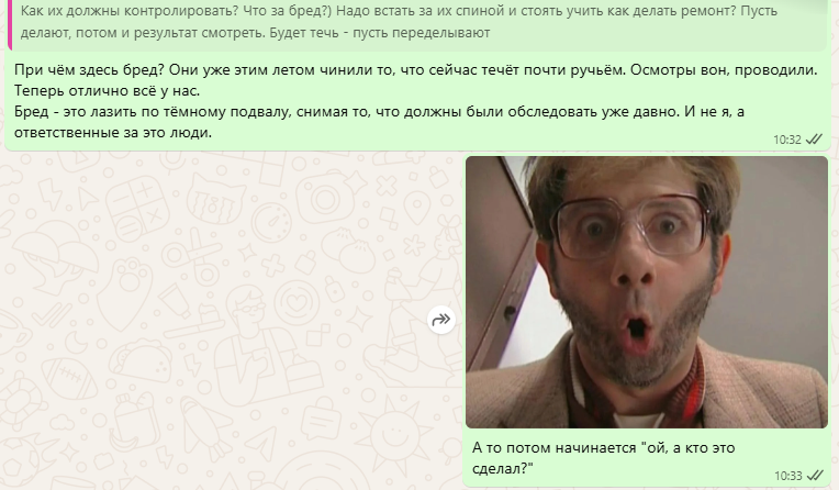 При виде фоток из подвала позвонил САМ ГЛАВНЫЙ БОСС УК и сказал, что так жить нельзя. Сегодня они наведут полный бардак порядок в трубах другого дома, во вторник срочно примчатся к нам и сделают из подвала конфетку. Во вторник я работала, так что план прикинуться медоедом и таскаться за ними шаг-в-шаг, полностью провалился.