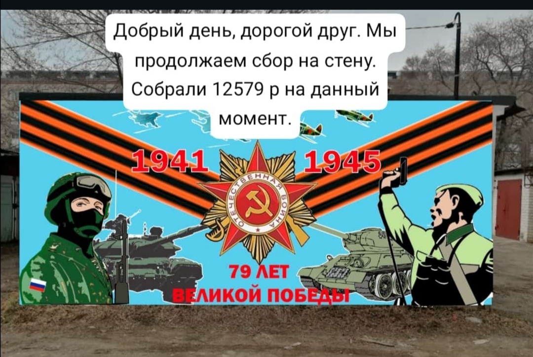 Привет из Благовещенска. Мы продолжаем сбор. На данный момент собрано, больше половины суммы, что нужно. Список людей, кто помогает делать картинку мы ведём. Планируем сделать табличку. На этих выходных, мы зачистим стену, сделаем фон ииииии можно будет наносить рисунок. Одна организация, если поможет с краской для фона и материалами для нанесения, то мы быстрее сделаем стенку. Спасибо тебе.