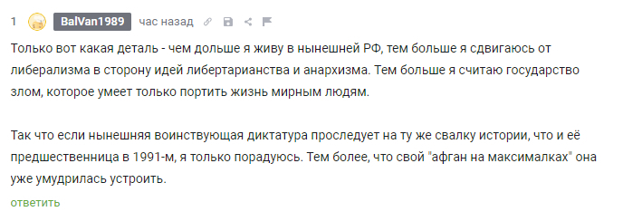 Только вот какая деталь - чем дольше я живу в нынешней РФ, тем больше я сдвигаюсь от либерализма в сторону идей либертарианства и анархизма. Тем больше я считаю государство злом, которое умеет только портить жизнь мирным людям.