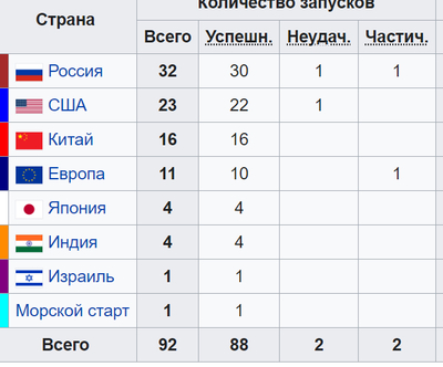 На 1 больше, чем у Австралии. Австралии, мать её. Я даже не знал, что у них космическая программа есть. В 5 раз меньше, чем у Китая. В 10 раз меньше, чем у США (вернее у Илона Маска, потому что 90% приходится на него).