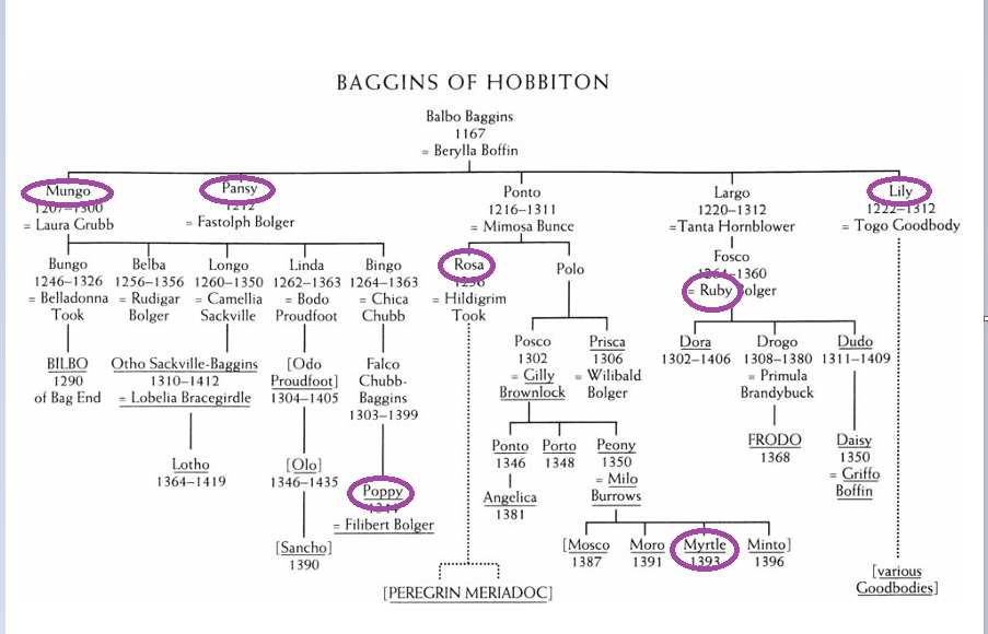 Я упоминала в первоначальном посте и задавала вопрос в комментарии #comment_328422170, откуда в поттериане столько цветочных имён, теперь сама на него отвечаю. Недавно прочитала «Властелин колец» в оригинале и многое прояснилось. Посмотрите на родословную Бэггинсов. Вот где растут эти цветы и не только цветы.