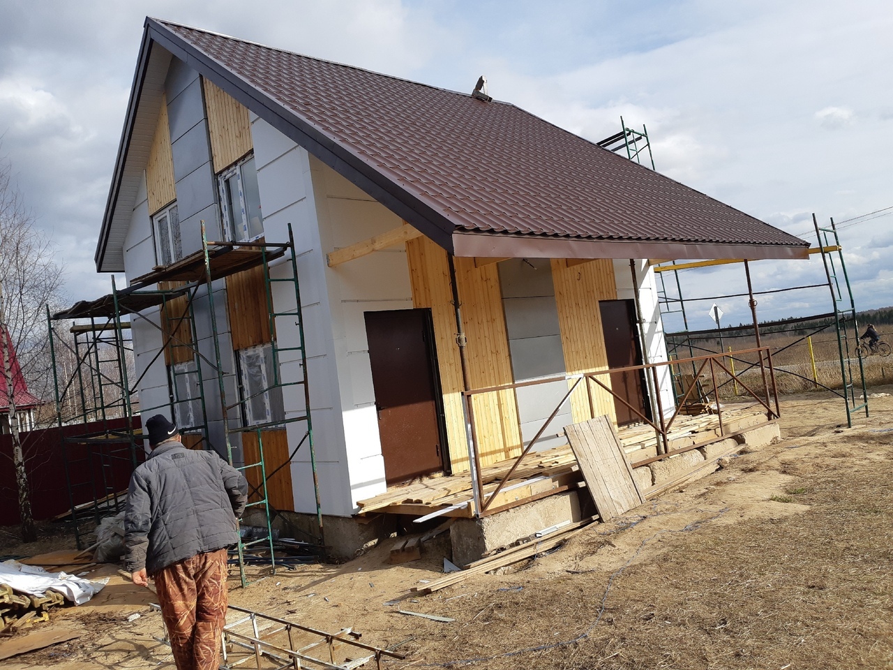 Если бы опоры были нерегулируемые, при просадке подобного фундамента (а просадка будет как не трамбуй) на скате крыши образуется видимый излом, либо скат отойдет от стены и будет щель. При постройке этого дома, разница в просадке основного фундамента и опорной линии веранды составила 50 мм. Это было компенсировано винтовыми опорами в прошлой жизни бывшими стойками опалубки перекрытий. Вот они на фото. Естественно, опоры эти должны быть жестко связаны между собой- чтобы не болтались. Эту функцию выполняют перила из жесткого стального профиля. Кстати эти перила достались тоже почти даром. Это каркасы ворот металлического гаража, не выкупленного заказчиком у знакомых гаражестроителей. Там же прикуплены и каркасы заборчика.