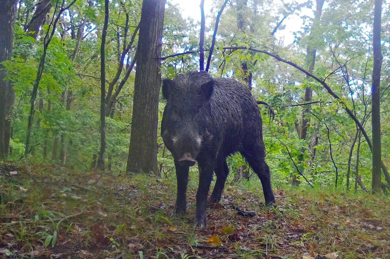 Взрослый кабан ещё не обсох после недавно прошедшего дождя. Летом лес в юго-западном Приморье влажный и тёплый, как в субтропиках, поэтому на "просушку" потребуется немного больше времени.