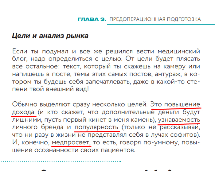 И есть у меня ощущение, что автор понимает, что если бы в книге не было денежного мотива, а целью было именно повышение мед грамотности населения, то она бы никого не заинтересовала. Почему? Ну хотя бы потому что пишет следующее: