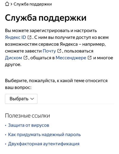 У меня эта страница выглядит так и при выборе конкретных вопросов открываются страницы со статьями и ссылками на поддержки других сервисов.