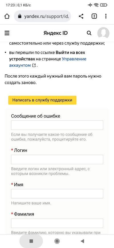 https://yandex.ru/support/id/feedback.html - есть там обратная связь с поддержкой, только перешёл по ссылке и проверил
