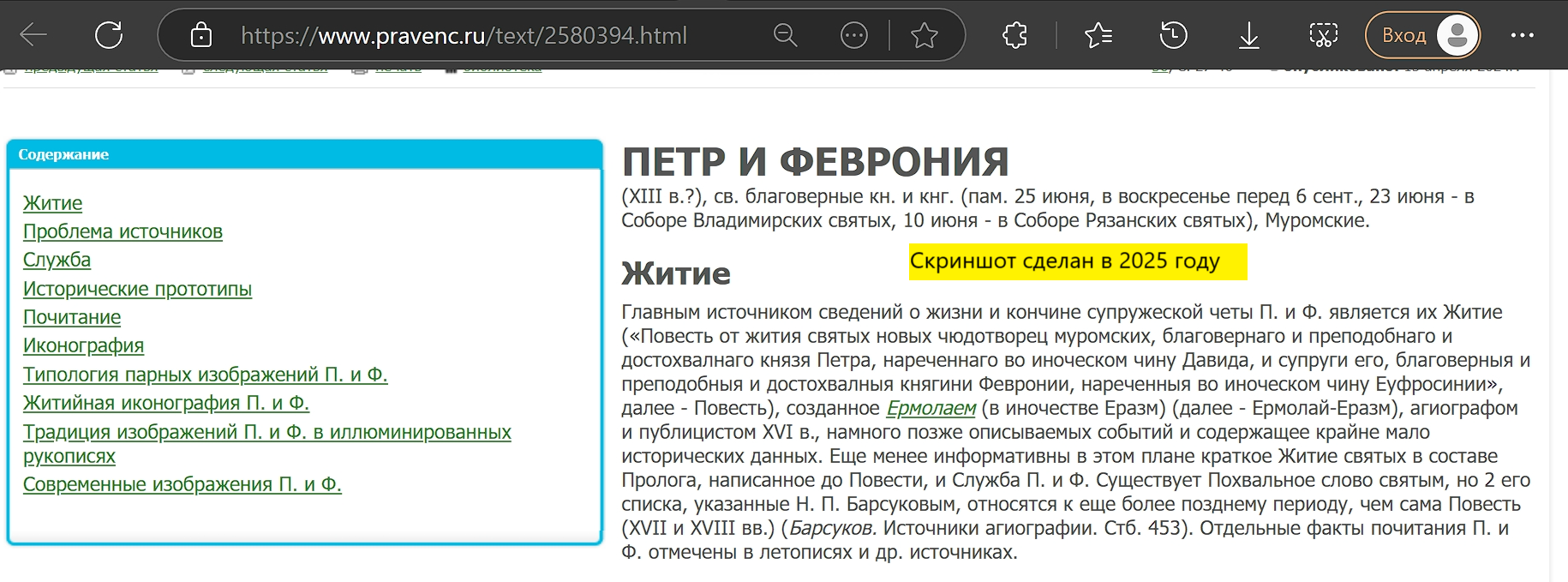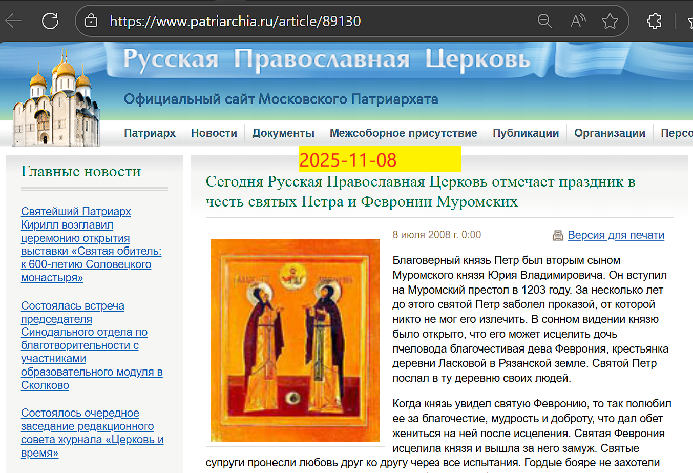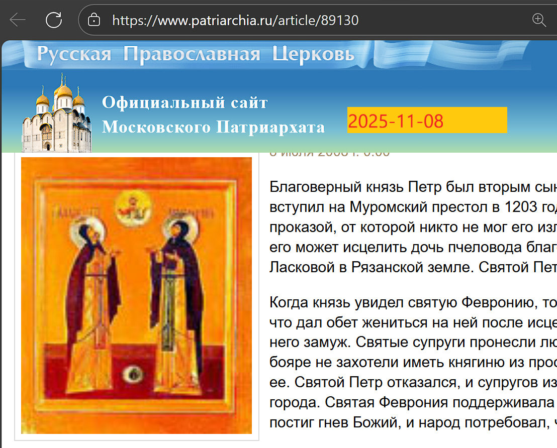 В 2025 году, в ноябре, я обнаружил, что на официальном сайте Русской Православной Церкви Московского Патриархата с одной страницы сайта удалено житие Петра и Февронии Муромских - святых РПЦ МП.