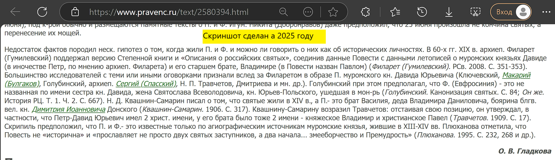 Однако Житие Петра и Февронии на сайте "Патриархия ру", размещенное в 2008 году по адресу: https://www.patriarchia.ru/article/89130 не удалено, его можно прочитать и сегодня.