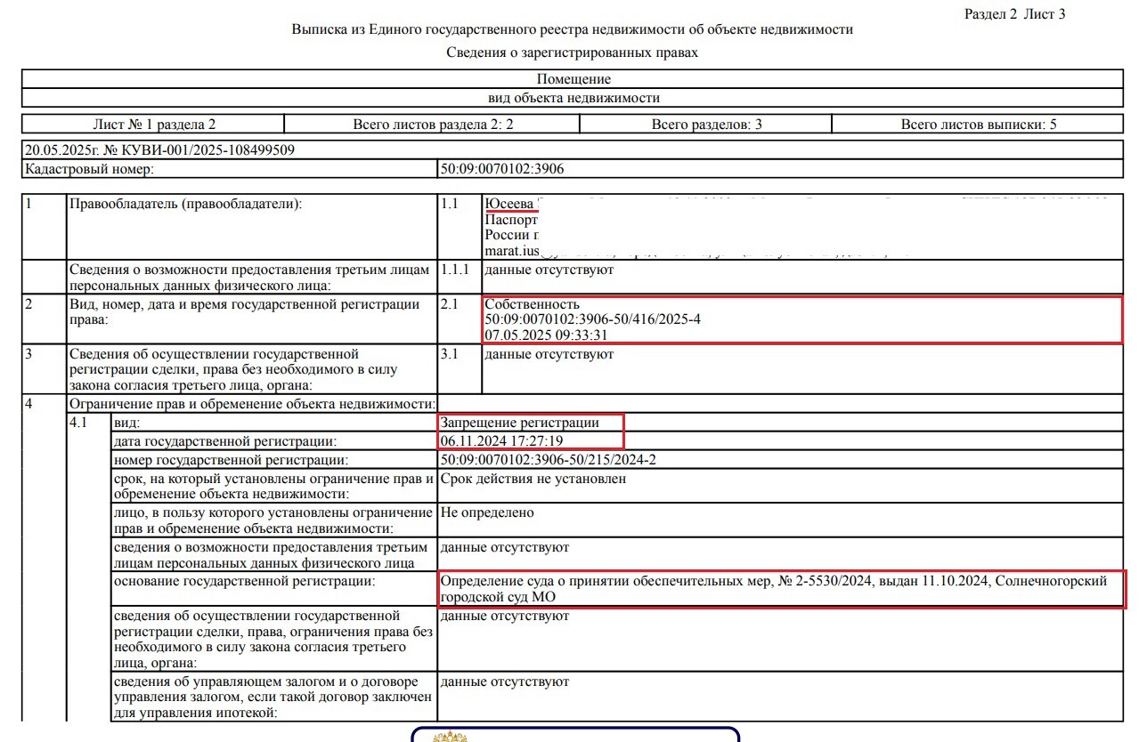 Выписка ЕГРН с отметкой о том, что новым владельцем квартиры с запретом рег. действий стал ближайший родственник учредителя должника