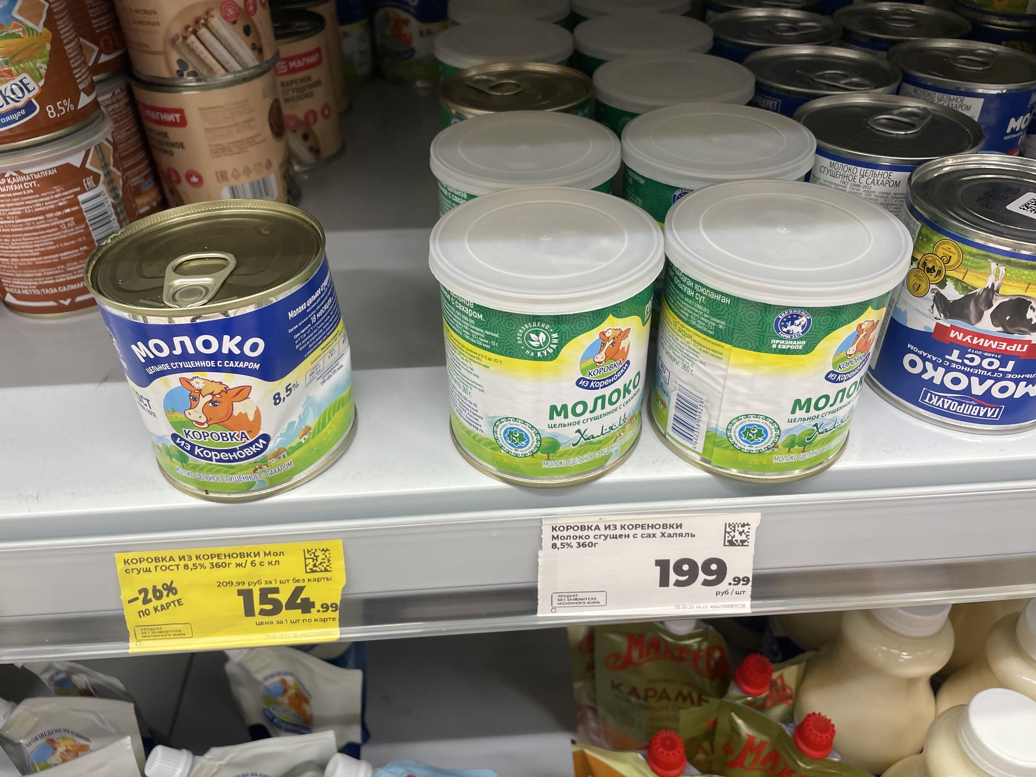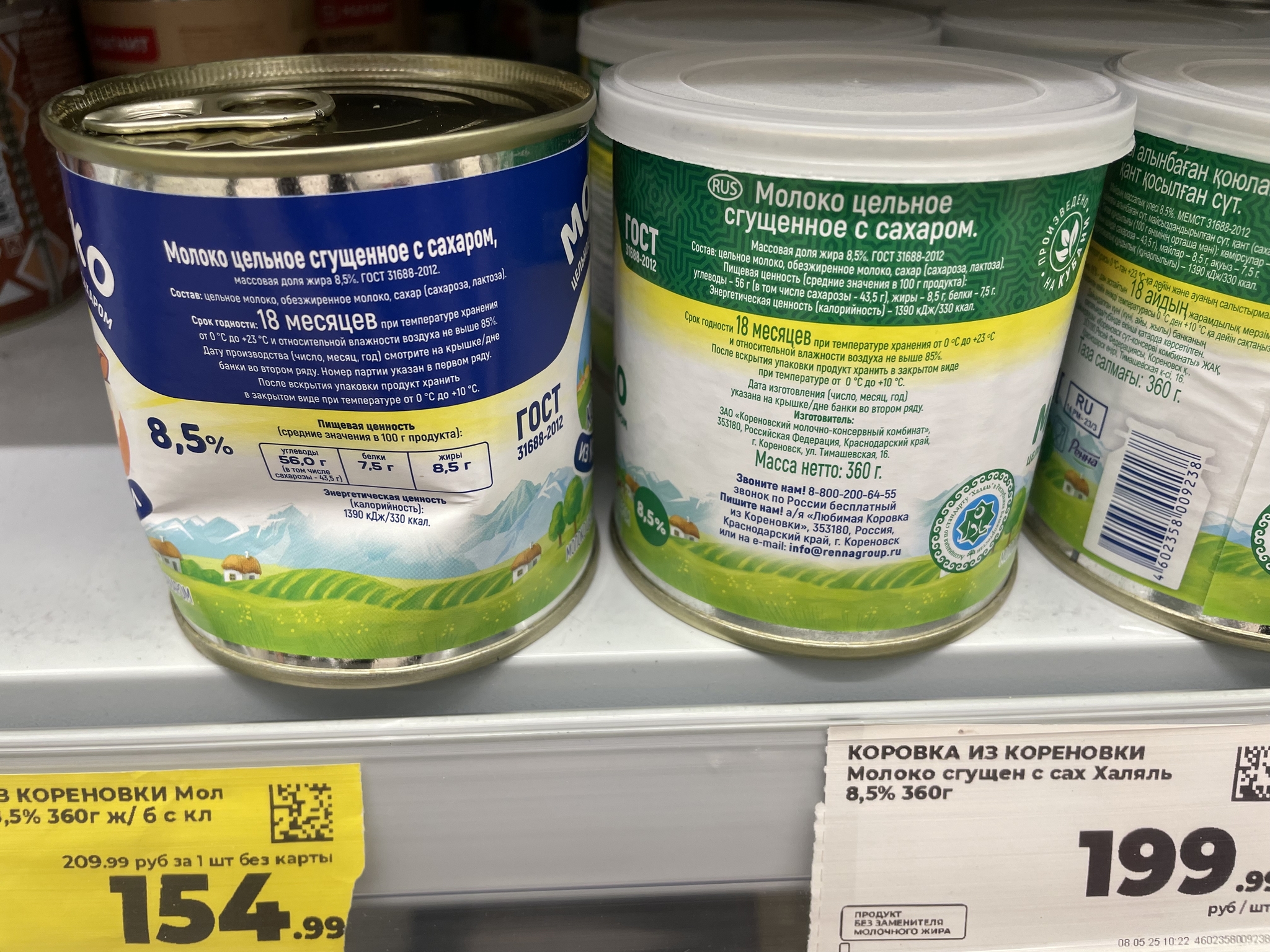 Снова зашел в этот Магнит, в глубине холодильника нашел обычную сгущёнку «коровка из Кореновки» и вот вам фото для понимания разницы, чем халяль отличается от нехаляль (харам?)