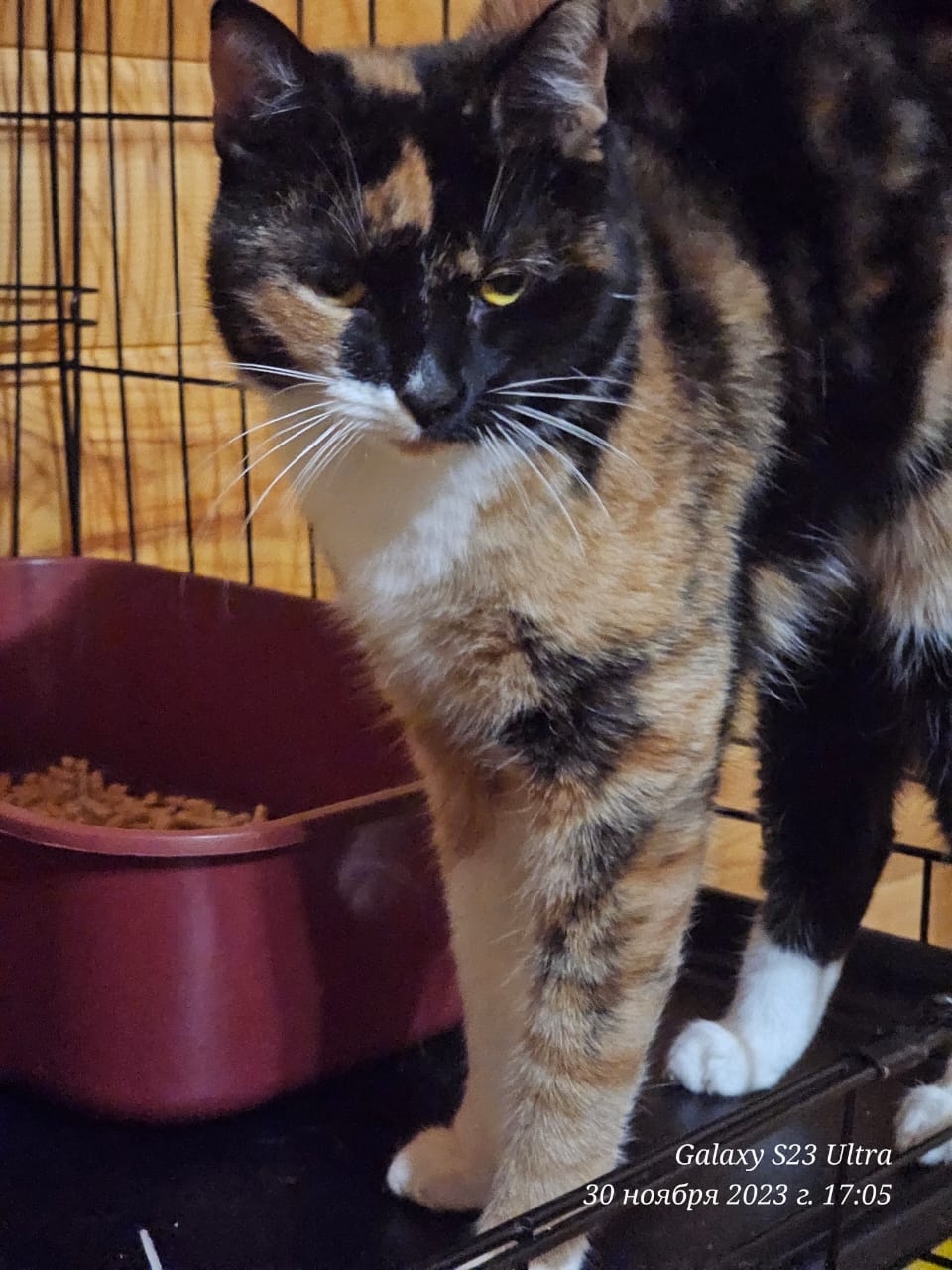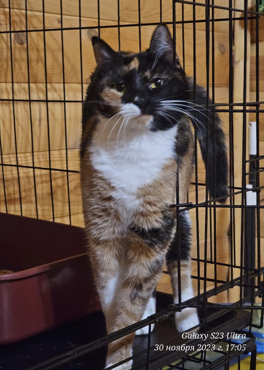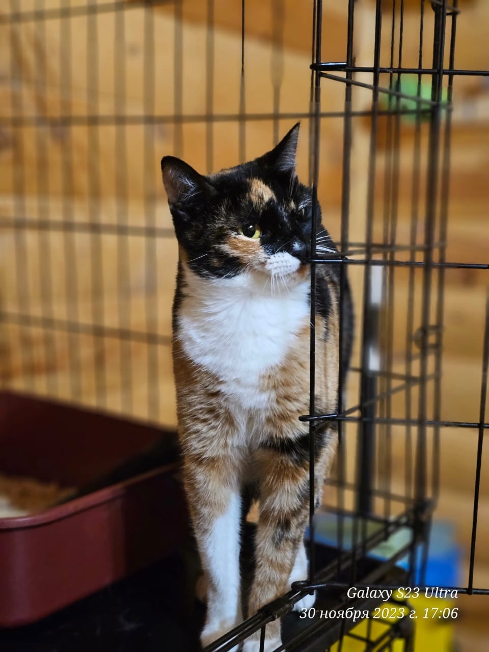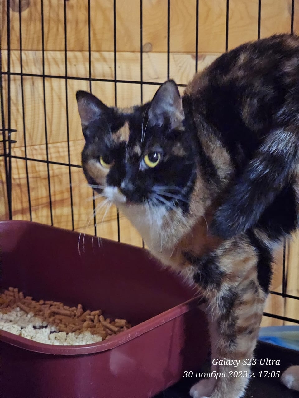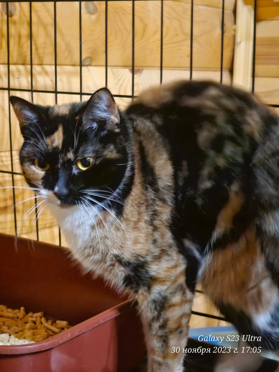 Кошечка с рынка. 5 месяцев назад она там родила. Но котята не все выжили, так как на рынке опасно. Поэтому кошку и оставшихся котят забрала в клинику. Котята уже пристроены. А мама всё никак(