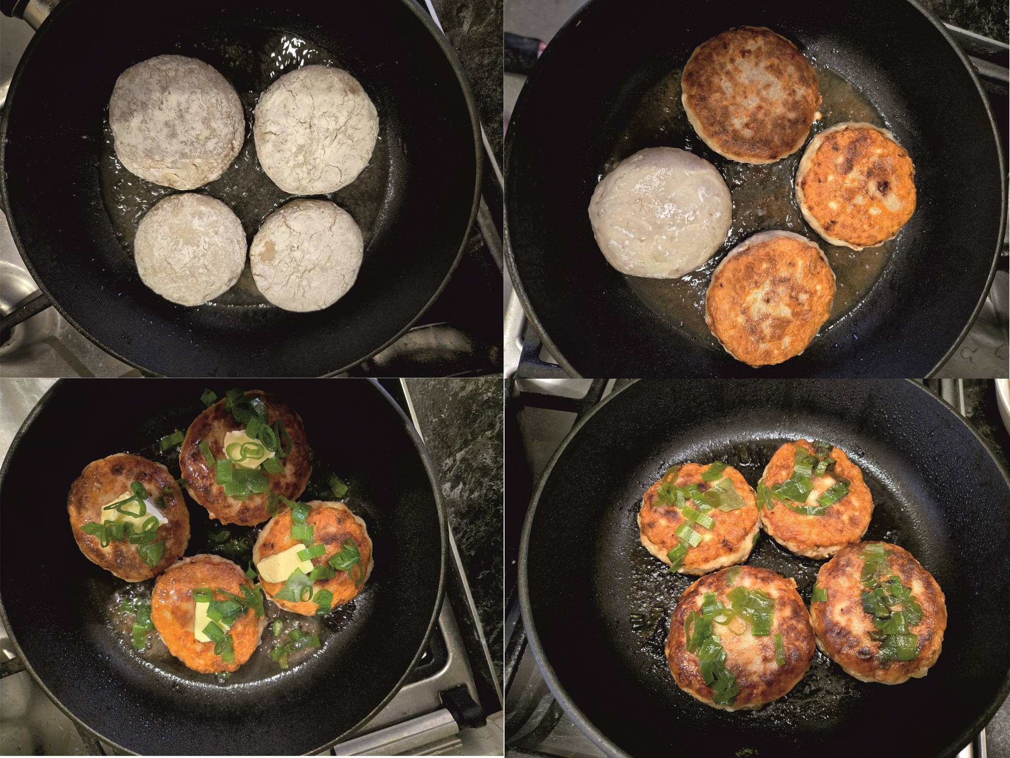 Пока рис варится, котлеты на сковородку. Только не оттаяли они сами, пришлось в микроволновке маленько разморозить. Обжариваем с двух сторон до такого цвета, кому какой нравится (пять и минут на всё про всё) и потом под крышкой на малом газу еще минуты 3-4 доводим до готовности. На финише можно сверху по кусочку сливочного масла бросить и зеленым луком присыпать (у меня дикий, опять же с балкона ;-))