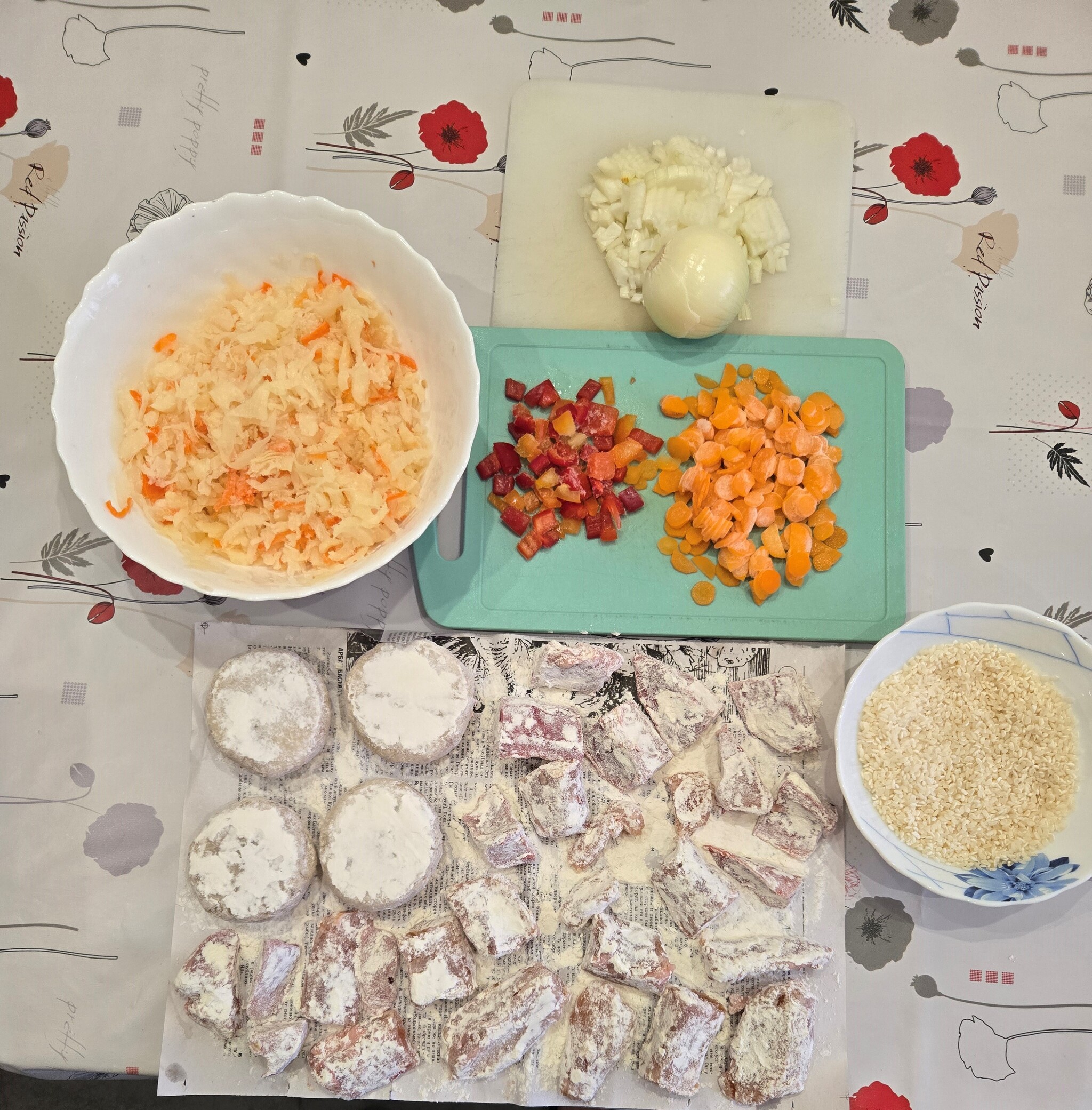 Дело было в минувшее воскресенье. К котлетам гарнир нужен - будет рис с овощами. В качестве салата - квашеная капуста. Опять же собственноручно засоленная и на балконе почивающая. Ну и, раз пошла такая пьянка, печень с икрой тоже пожарим.