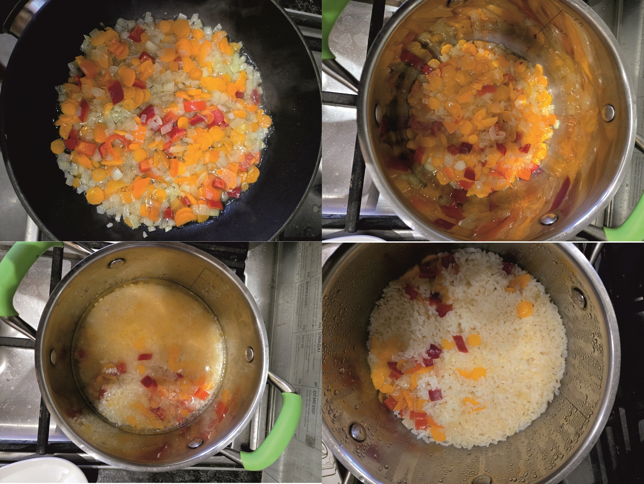 Пока котлеты оттаивают (а это важно, как показывает мой личный опыт), занимаемся рисом. Лук с морковкой на сковородку, под конец и перец туда же. Не знаю, как это у кулинаров называется: припустить или пассеровать? В общем, обжариваем слегка и на дно кастрюли. Сверху рис промытый, кипятка в пропорции к рису 2:1 и под крышку на минимальный газ.