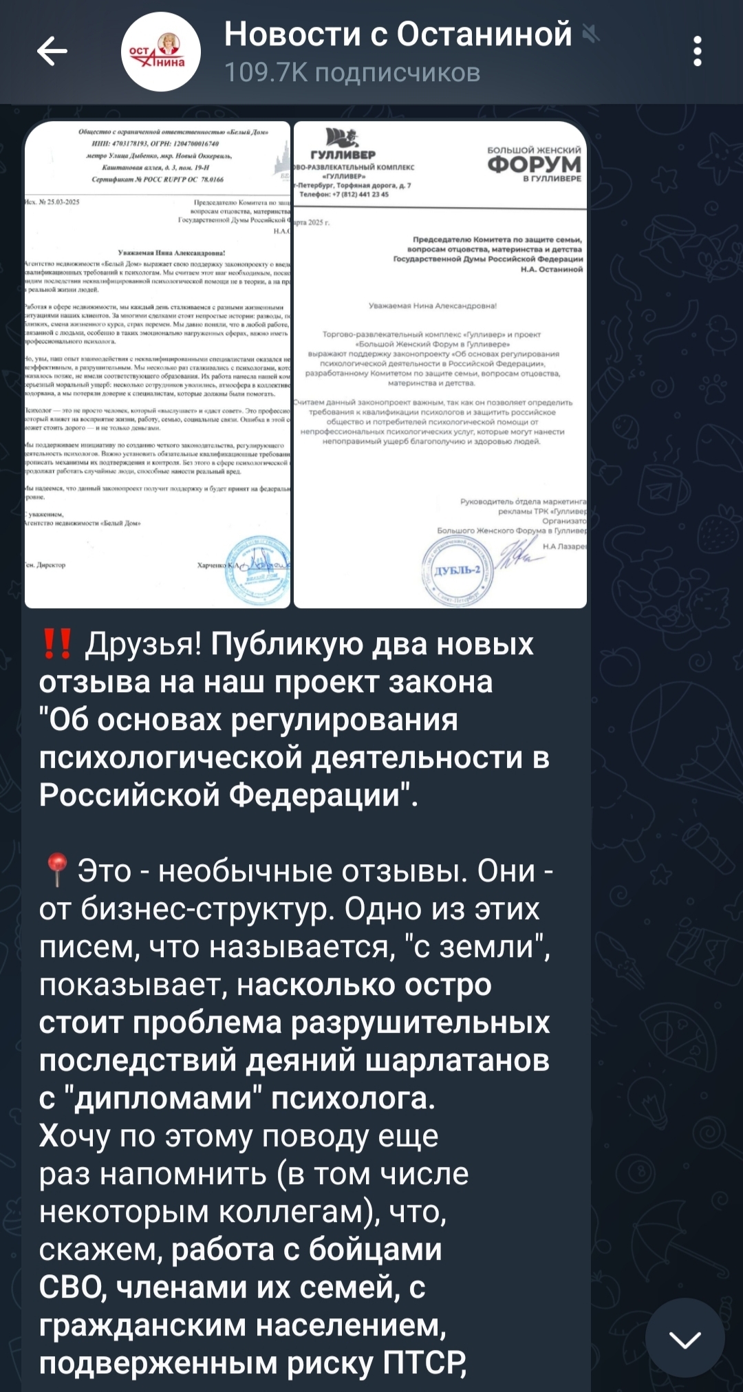 Бурная кипучая деятельность госпожи депутата Останиной продолжается - Мадама не стесняясь продолжает игнорировать Российское Психологическое Общество и выставляет документы в свою поддержку от "рогов и копыт" в духе 12 стульев!