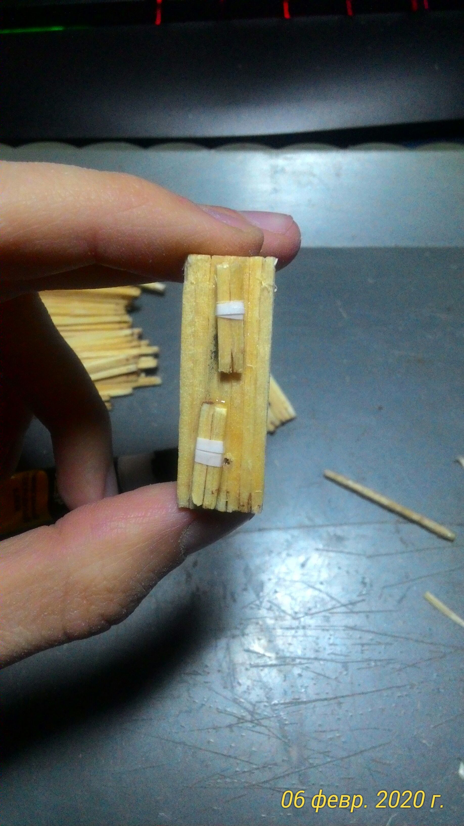 Сначала на "Момент" приклеивал полоску к створке на всю её ширину, затем по две спички сверху. Спички сразу обточил гравером. В боковых щитах просверлены отверстия под полоски. После продевания полосок в эти отверстия нужно их накрутить на спички и приклеить, хорошенько натянув: