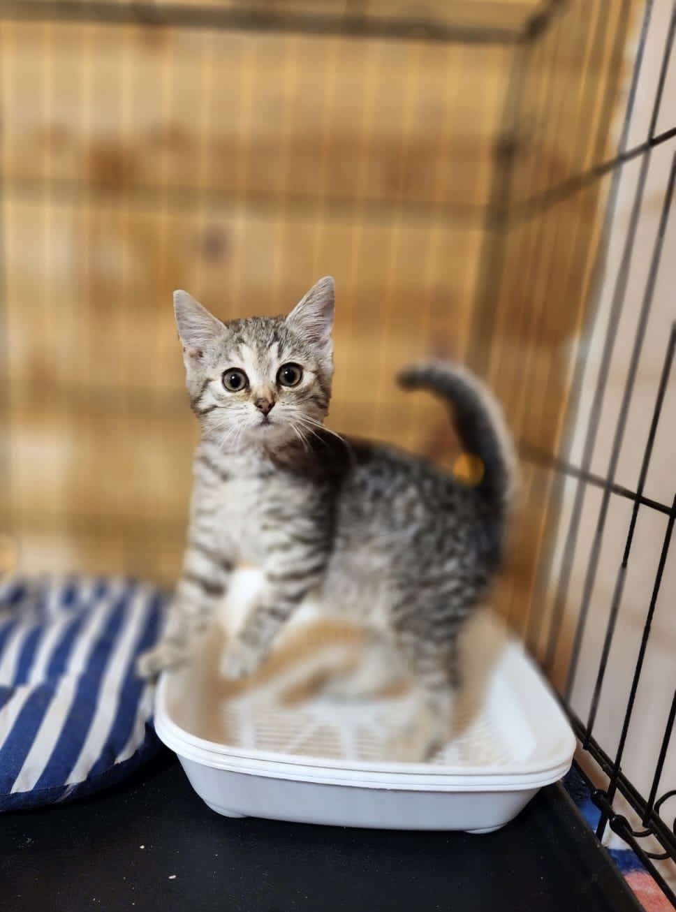 Буся очень активный задорный ребёнок, любимые занятия: кушать, играть, спать) К лоточку на передержке привыкла)
