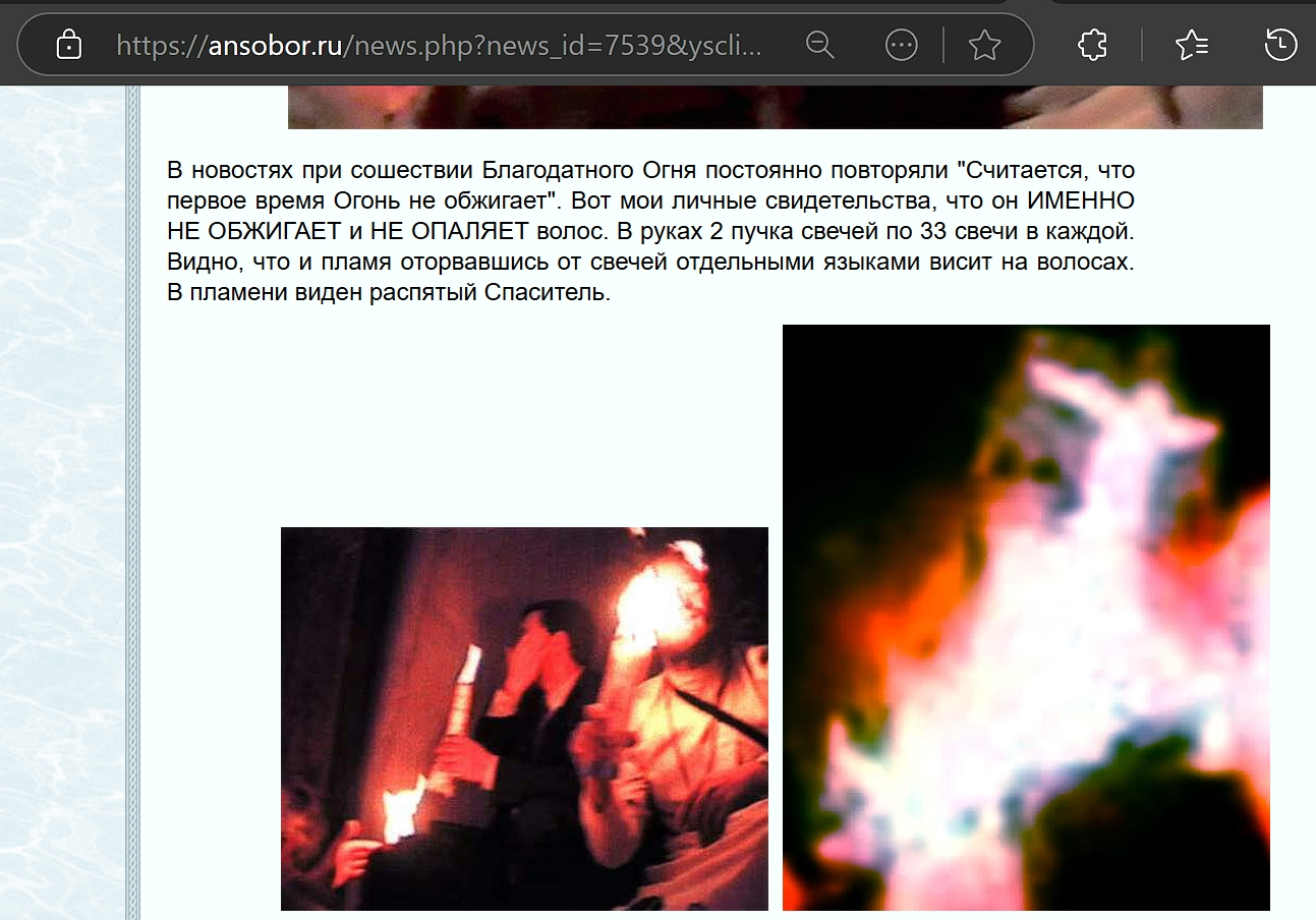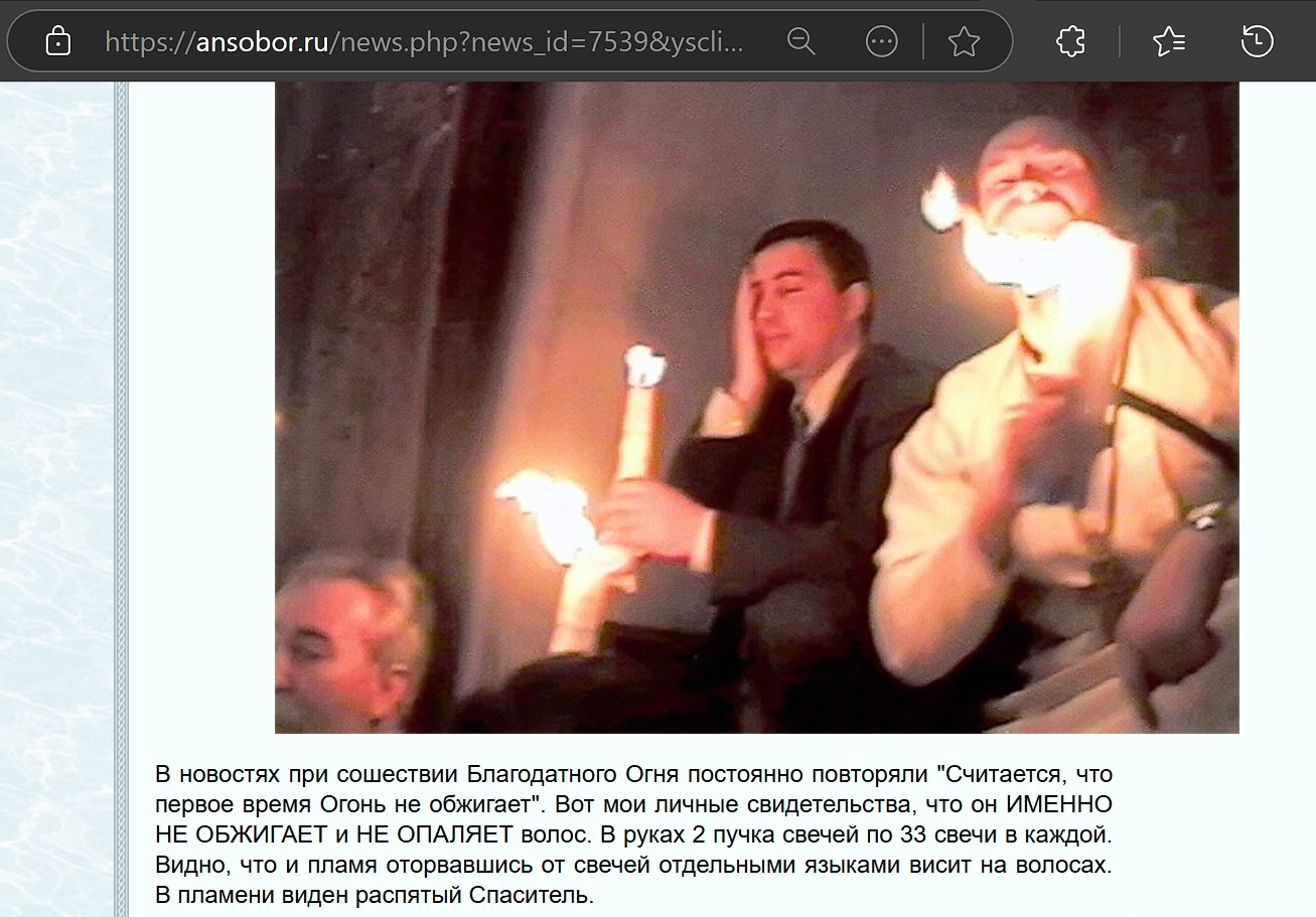 В моих руках был настоящий факел из 33 свечей, которым я водил по своей бороде, ощущая лишь теплое дыхание Благодатного Огня. И ничего не опалялось. Более того, у меня есть видеозапись этого момента, когда я прикасаюсь Огнём к своей бороде. Почему эти свидетельства не принимаются во внимание?
