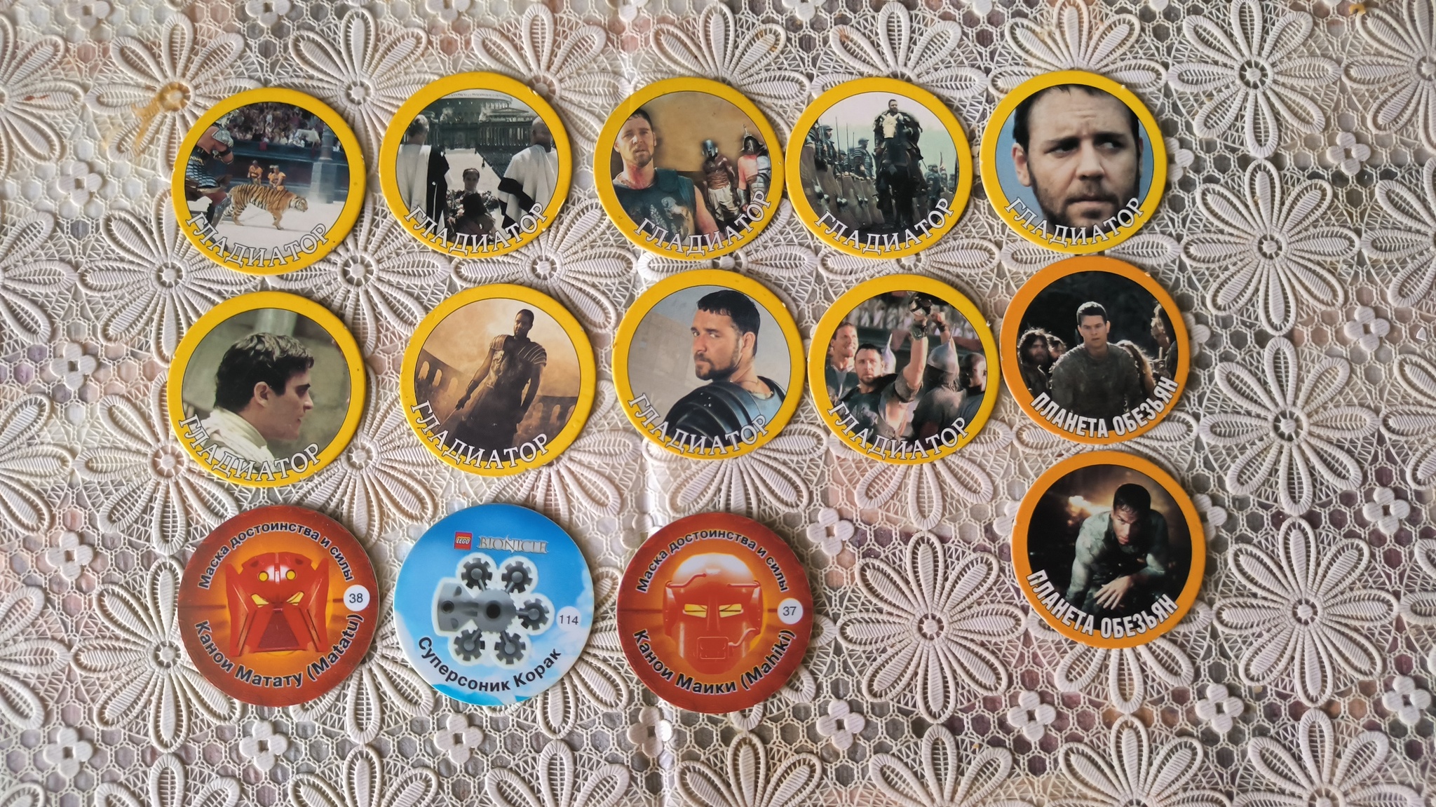 А вот гладиатор и планета обезьян. Под ними биониклы. Помню, что та, которая в середине должна была светиться в темноте.