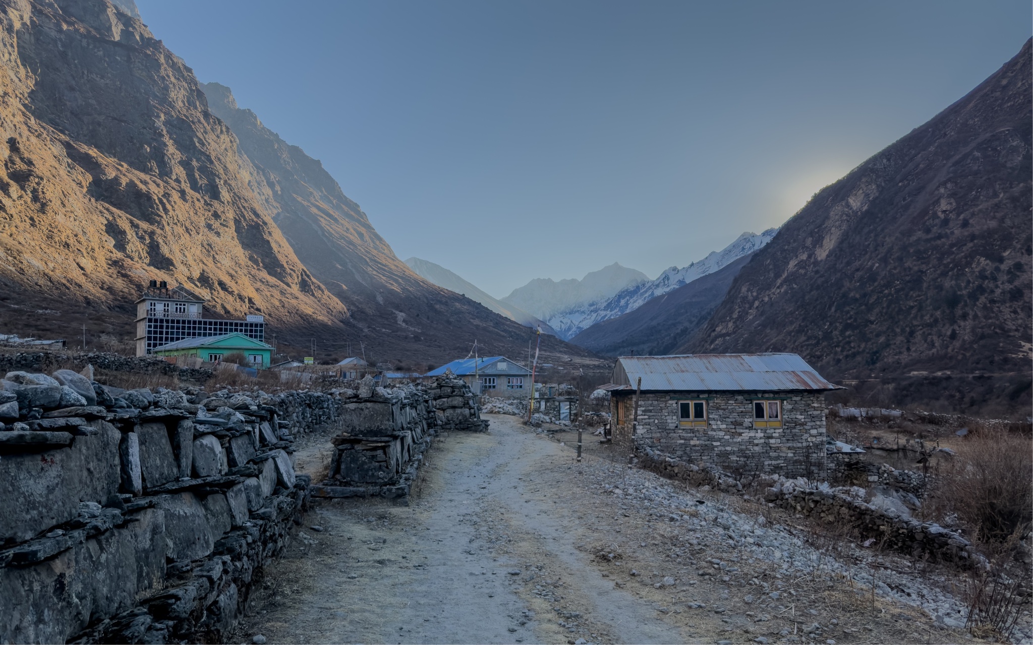 К вершине Лантанг Ри ведет узкая тропка. Здесь уже мало кто ходит из туристов. Надо успеть до гор и обратно, так как заночевать без снаряжения на 4200+ м зимой это самоубийство. В долине есть туристический домик. Он конечно спасет от ветра и вьюги, но согреться в нем будет сложновато. Дров тут не напасешься!