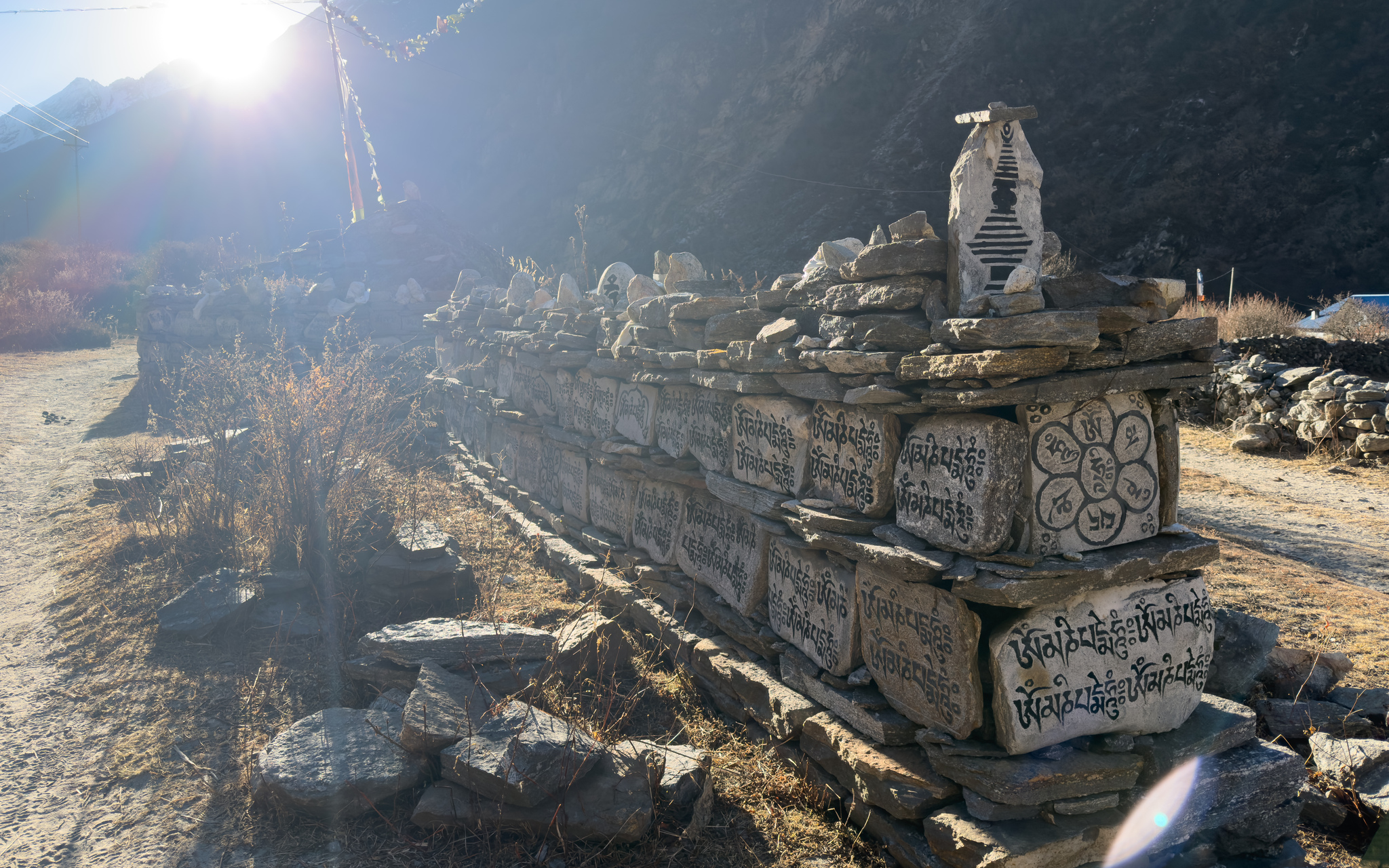 по пути есть небольшой монастырь и несколько ступ. Так же время от времени попадаются таблички с молитвами. Некоторые ступы здесь устроены по принципу водяной мельницы, только ничего не мелют, лишь крутят лопасти с молитвами. Это считается за прочтение. По сути мелят молитвы!