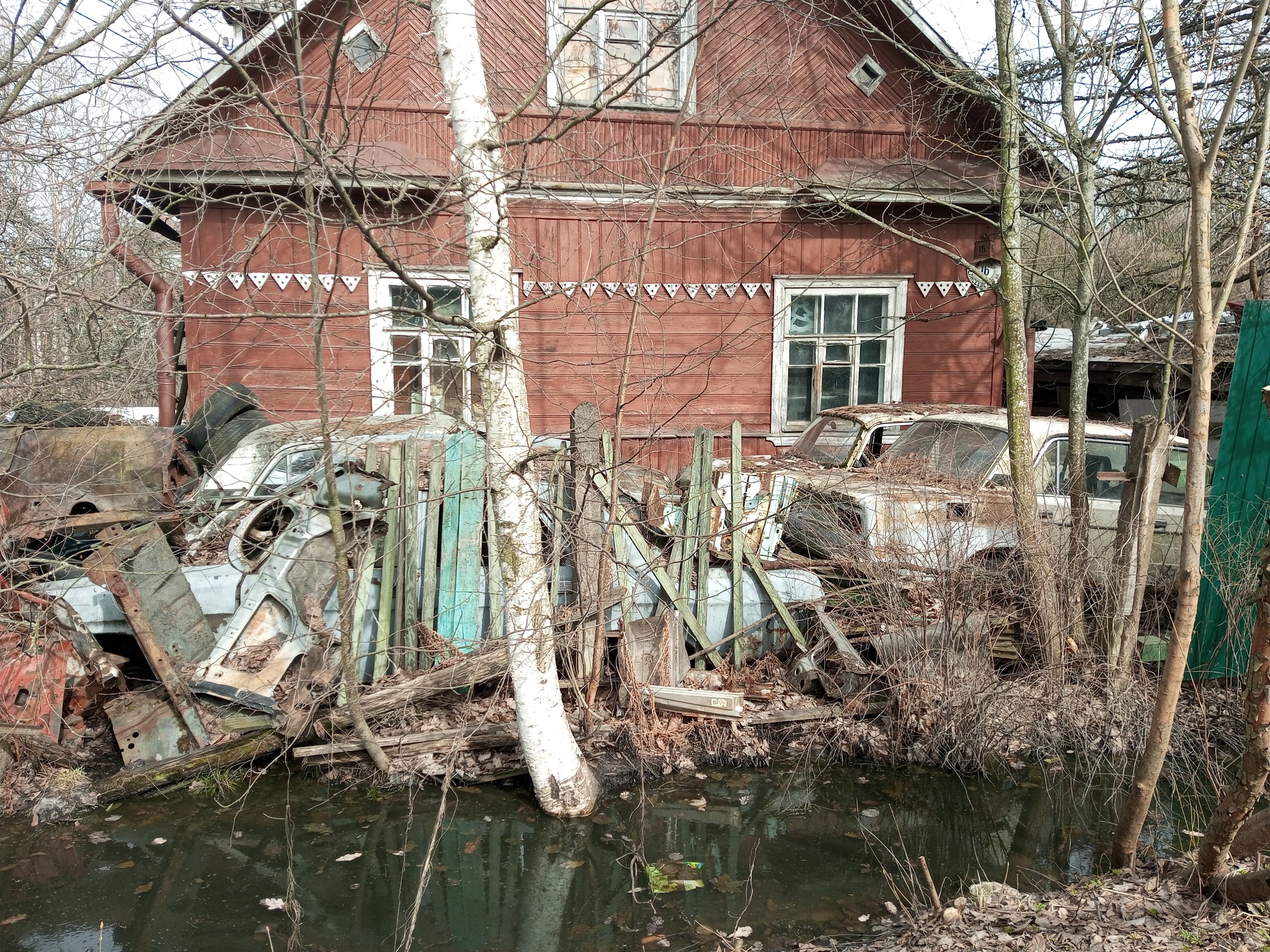 Недавно снова оказался на той улице, и ранневесеннее отсутствие зелени дало возможность получше осмотреть участок. Конечно, не буду утверждать, что хозяин, даже если он и действительно занимается разбором автомобилей (предположили в комментариях), плохо дружит с головой - я этого не знаю наверняка. Но место, как скажет молодежь, "реально криповое" )))