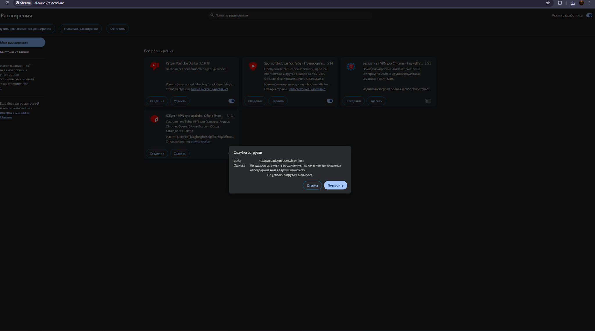 В первую очередь, сносим заблокированное расширение uBlock Origin (chrome://extensions/)