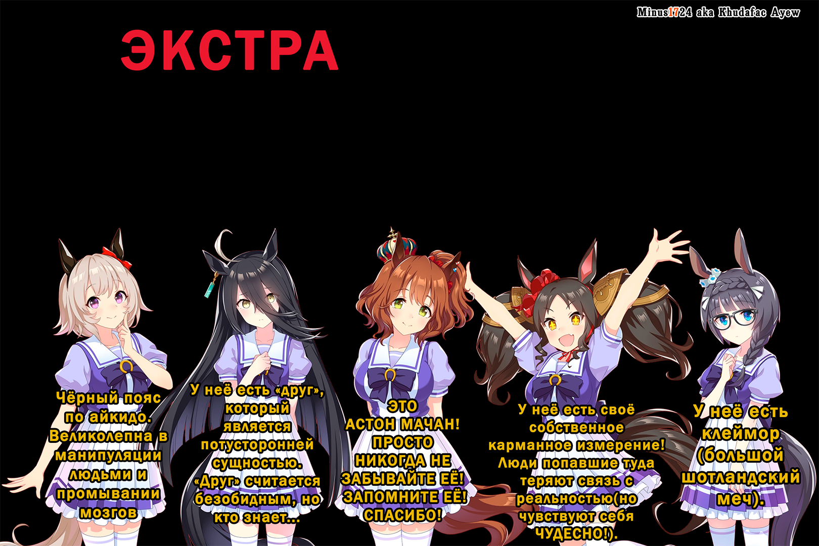 18 KhudafacAyew Аниме Серия Uma Musume Продолжение поста «Опасные Ума Мусуме»1 1 день назад Дополнение к предыдущему посту. Здесь уже всё чисто от меня. Это не перевод с дополнениями, это чисто мой контент по мотивам оригинального поста. [моё] Аниме Аниме мемы Uma Musume Pretty Derby Reddit (ссылка) Длиннопост Curren Chan Manhattan Cafe Aston Machan Zenno Rob Roy (Umamusume) Mayano Top Gun Daiichi Ruby Haru Urara Agnes Digital Sweep Tosho Blue Archive Ответ на пост 3 Ещё 0
