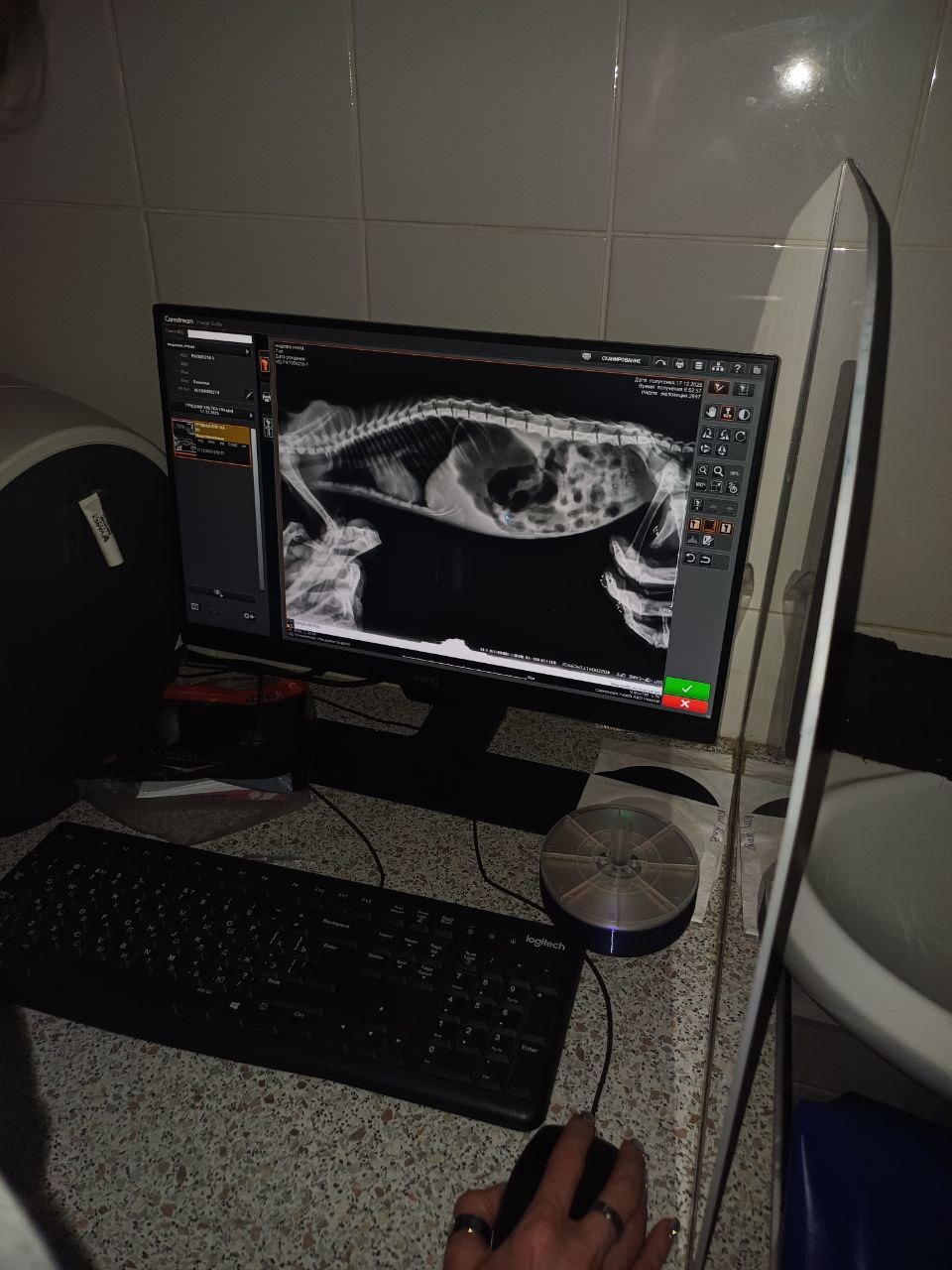 Узи. Отлично, что нет никакой жидкости. Но кишечник полон газов. Кошка которая весит 740 граммов в свои 9 месяцев, как маленький шарик надувается.