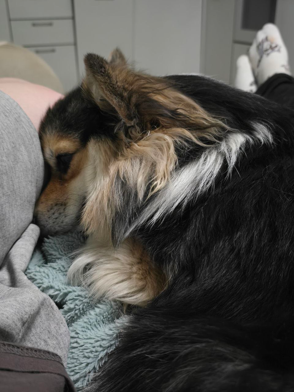В-четвертых, это большой (ну... по сравнению с котиками) классный обнимательный кусок меха, и главное - послушный (опять же, по сравнению с котиками, которые хочу приду, хочу нах пошлю). Её можно сгрести в охапку, положить рядом и тискать, и она даже будет радостно лежать (нуу... минут 10, потом уходит в ноги - то ли ей жарко, то ли от котов набралась независимости)