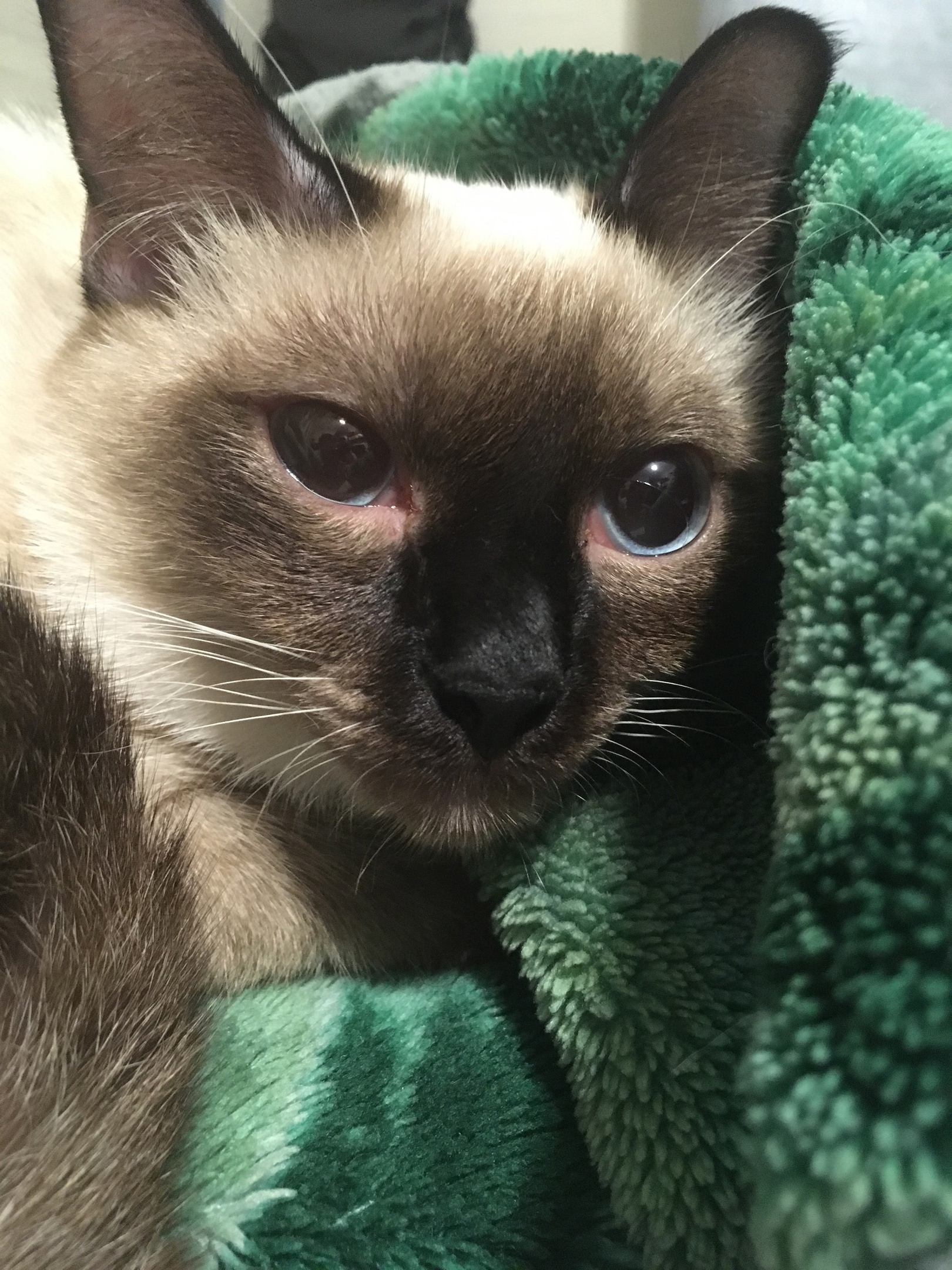5 ноября 2019 года мне подарили настоящего живого кота. Сначала я хотела назвать его именно Гагариным, но так как в его огромные грустные глаза даже жалко было смотреть, я назвала его просто - Юра. Он оказался окраса сил-поинт, с теплым контрастом темных лапок, мордочки и ушей на фоне светлого тела. Он очень ласковый и нежный, и хрюкает, когда вылизывается. Когда Юра только появился у нас, он много и сильно кричал по ночам. С десяти вечера до десяти утра он звал своих родственников. Он плакал почти весь первый месяц и скучал, пока адаптировался и искал свое место в новом доме. Первая неделя для кота прошла в нашей комнате, где он прятался под диваном, наблюдая за нами с безопасного расстояния, в то время как я познавала глубины недосыпа, плавно переходящие в депривацию сна. Почти сразу после того, как мы его взяли, нам пришлось идти в ветклинику.