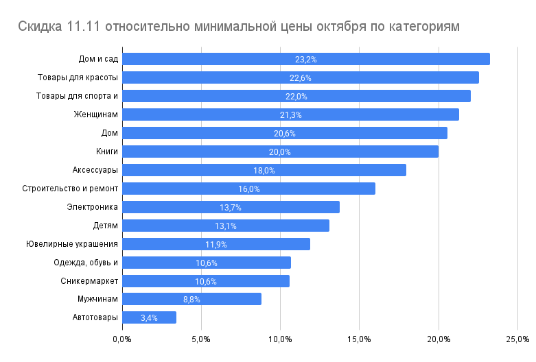 Взял все товары, у которых 11.11 цена была ниже минимальной за октябрь, затем усреднил размер скидки. Вот категории, в которых можно найти реальные скидки. Вряд ли такой же результат будет в другие распродажи, скорее, просто так сложилось