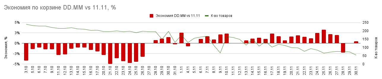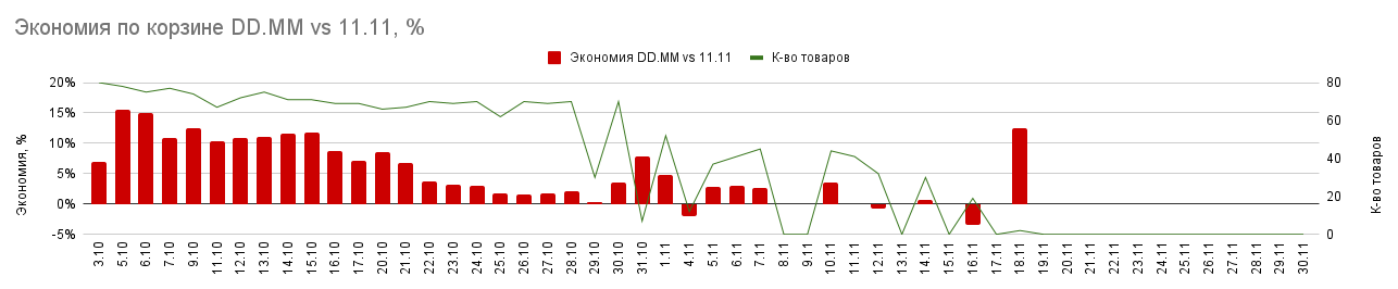 Например, на первом графике первый столбик от 03.11 показывает 6% - это значит, что если я куплю всю корзину в распродажу 11.11, то сэкономлю 6% по сравнению с 03.11.