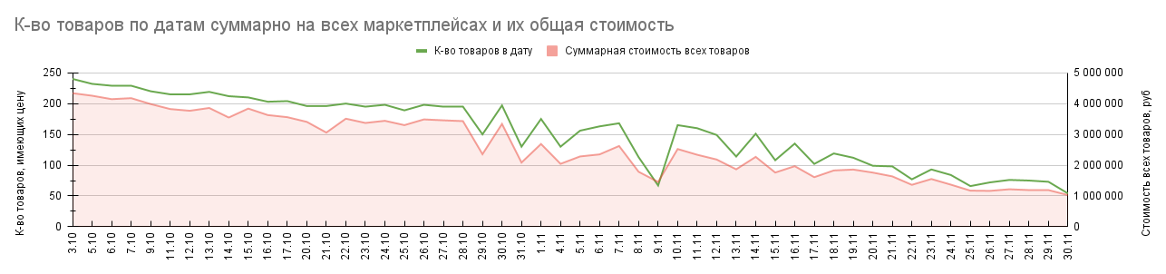 Зеленая линия (левая ось) - сколько товаров в указанную дату в индексе цен суммарно по всем маркетплейсам. Красная область (правая ось) - их суммарная стоимость. К 11.11 осталось 160 товаров.