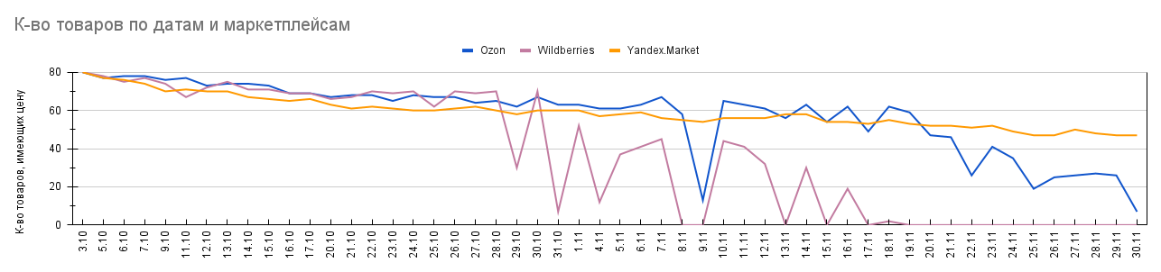 Хотел посмотреть что будет с ценами на различные товары на топ-3 маркетплейсах России. Следил в течение почти двух месяцев: с 03.10.2025 по 30.11.2025.