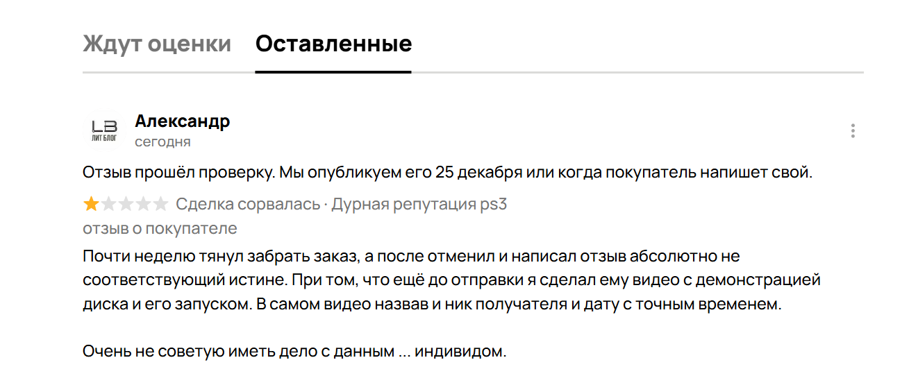 И вот вроде бы, ну подожди ты 2 недели, но какого чёрта? Он написал свой отзыв (который конечно истина и не ложь проходящая 2 пунктам оспаривания из той пачки что выдаёт сам авито на выбор) сразу и он был опубликован СРАЗУ.