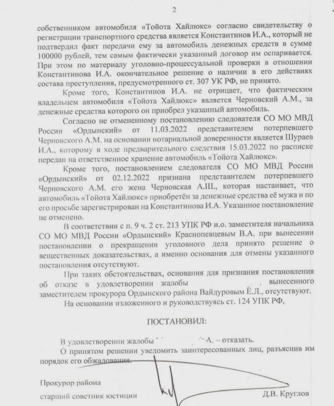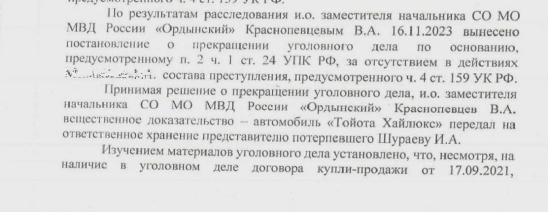 Оба ответа обжалованы в Прокуратуру области, которая изучив материалы дела, отменила постановление о прекращении уголовного дела и вернула его на доп. расследование, прокомментировав что решение по вещ. доку фактически принято не было.