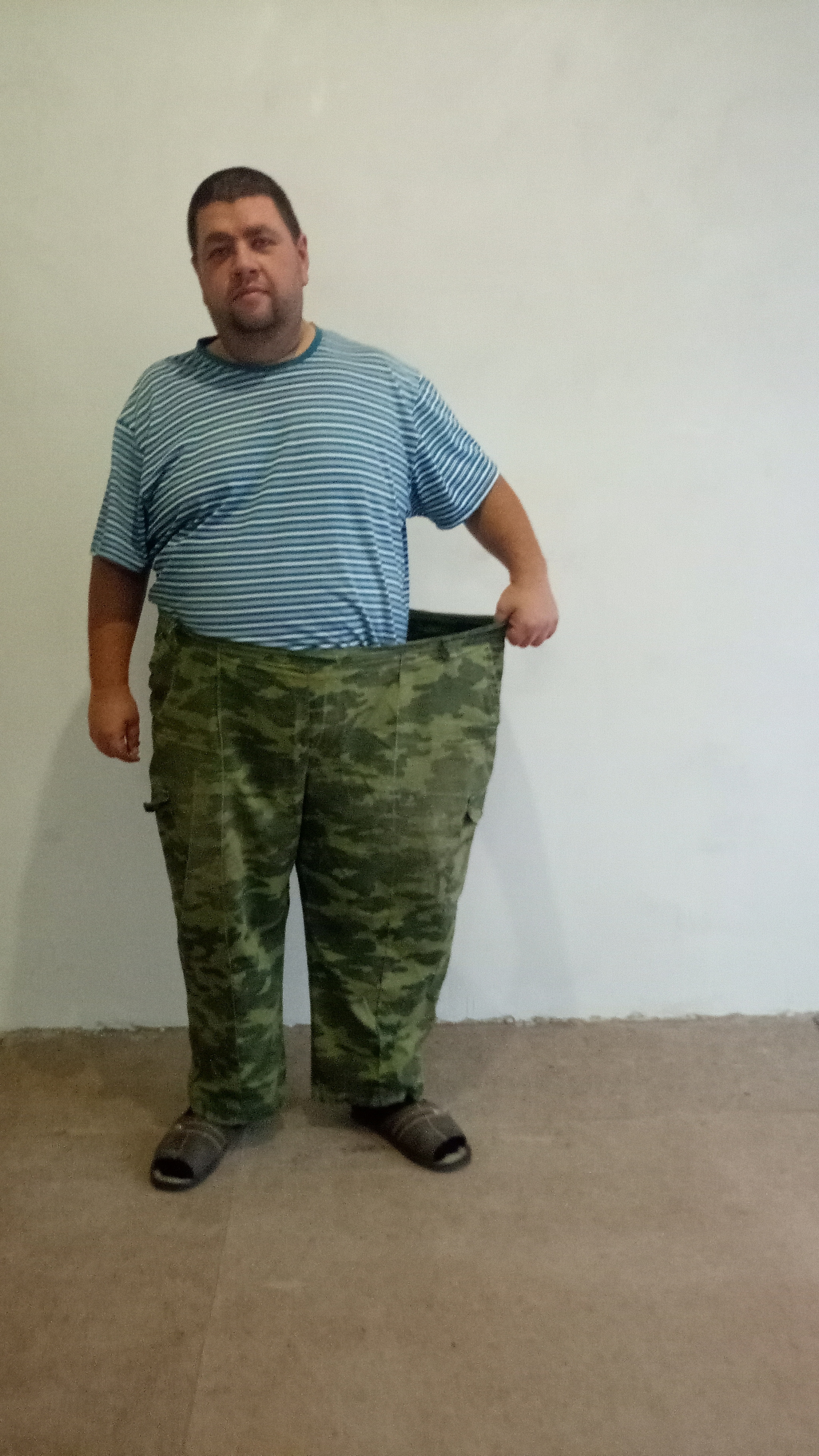 Продолжаю сидеть на диете, добавил рыбу в рацион. Очень рад результату, вся старая одежда дома закончилась(вся большая), столько я не весил лет 15. Жаль что размер обуви с весом не ушел(50 размер) :).